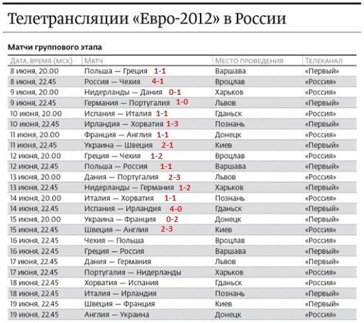 Кол-во скачиваний: 176Таблица трансляций: (спасибо PozaRezz!) Группа А: Греция Польша Россия Чехия Группа В: Германия Дания Нидерланды Португалия Группа С: Ирландия Испания Италия Хорватия Группа Д: Англия Украина Франция Швеция Игры: Группа А: Польша - Греция 1 - 1 (8 июня) 1:1 Россия - Чехия 4 - 1 (8 июня) 4:1 Греция - Чехия (12 июня) 1:2 Польша - Россия (12 июня) 1:1 Чехия - Польша (16 июня) 1:0 Греция - Россия (16 июня) 0:1 Группа В: Нидерланды - Дания (9 июня) 0:1 Германия - Португалия (9 июня) 1:0 Дания - Португалия (13 июня) 2:3 Нидерланды - Германия (13 июня) 1:2 Дания - Германия (17 июня) 1:2 Португалия - Нидерланды (17 июня) 2:1 Группа С: Испания - Италия (10 июня) 1:1 Ирландия - Хорватия (10 июня) 1:3 Италия - Хорватия (14 июня) 1:1 Испания - Ирландия (14 июня) 4:0 Хорватия - Испания (18 июня) 0:1 Италия - Ирландия (18 июня) 2:0 Группа Д: Франция - Англя (11 июня) 1:1 Украина - Швеция (11 июня) 2:1 Украина - Франция (15 июня) 0:2 Швеция - Англия (15 июня) 2:3 Швеция - Франция (19 июня) 2:0 Англия - Украина (19 июня) 1:0 Четвертьфиналы: Чехия - Португалия (21 июня) 0:1 Испания - Франция (23 июня)2:0 Германия - Греция (22 июня) 4:2 Англия - Италия (24 июня) 0:0 (по пенальти 2:4) Полуфиналы: Победитель Португалия - Испания (27 июня) 0:0 (по пенальти 2:4) Победитель Германия - Италия (28 июня) 1:2 Финал: Испания - Италия 4:0 -------------------- Самый надёжный план: -Фигня! На месте разберёмся!!!