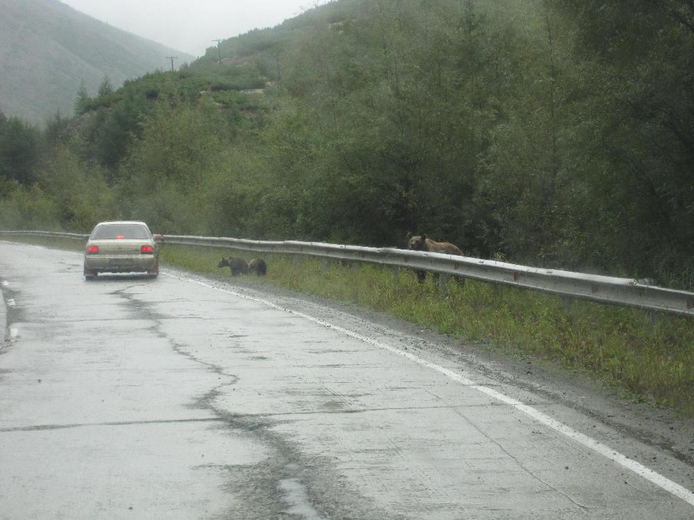 На карамкенском перевале вторую неделю вижу двоих медвежат, подходят к дороге и занимаются попрошайничеством.