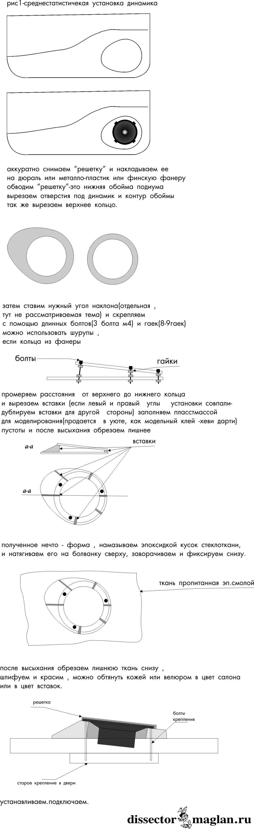 пример изготовления приведен Сообщение #11 делал по этой схеме. единственное обошолся без болтов и гаек. воспользовался шпильками,просверлил в кольцах отверстия,нарезал в них резьбу и вкрутил шпильки. получилось отлично ,можно регулировать все до мм и наклон и направление. вобщем принцип тот же только вид с боку спасибо дядьке dissectorУ за выложенную инструкцию. не нужно лопатить инет а и еще. за изготовление таких подиумом запросили 5-6 тыр. послав в дальнее путешевствие типочка, принялся сам делать, так как ценник вдохновил на творчевство Спасибо! — Торонага