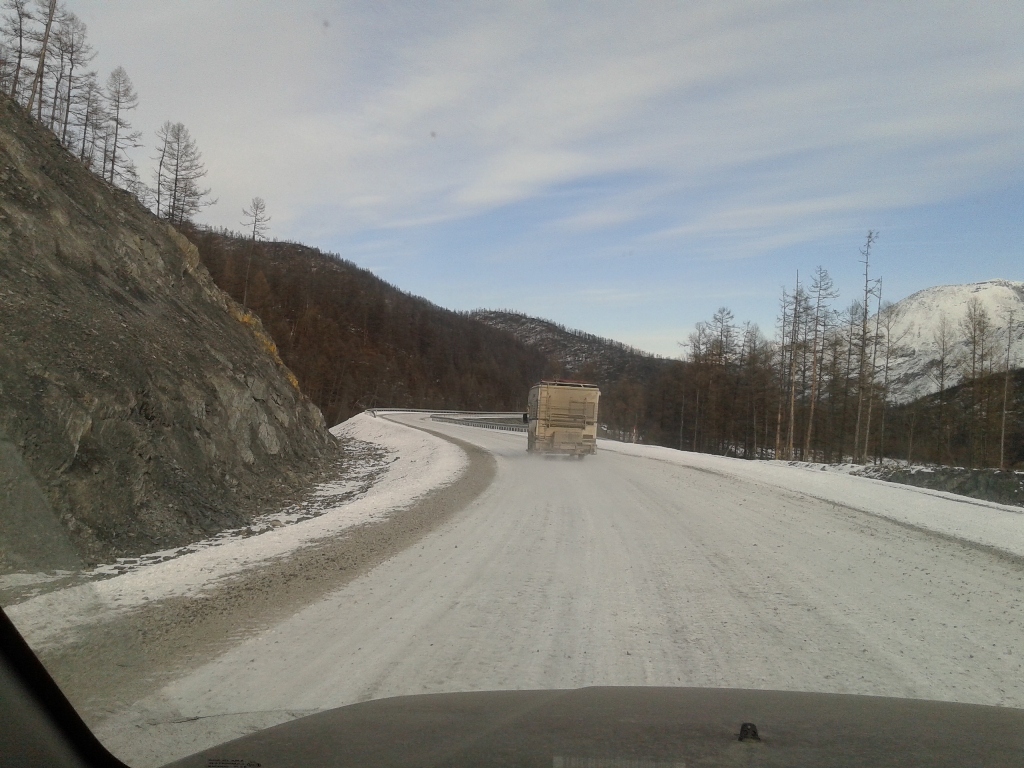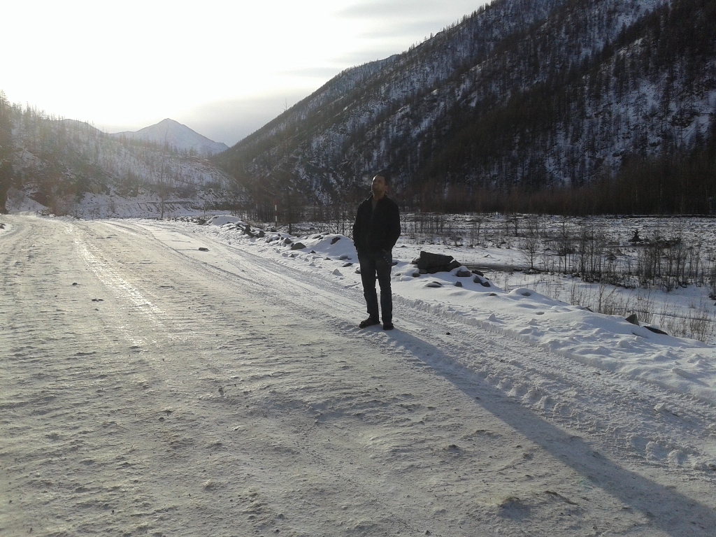 Кстати вот так было по погоде в итык кюеле Добравшись до Тёплого ключа,заехали на заправку,да и вообще остановились попинать по колёсам да с морозцем.Самое интересное что в хандыге было -8,а в тёплом ключе весна +1 и дорога начала местами таять,но правда ненадолго,буквально 30 км от посёлка всё встало на свои места -8 -10 Впереди были видны горы и мне почему-то стало очень комфортно и спокойно на душе. Перевалив Томпорукский перевал едем дальше,я залипая в окошко на горы,два раза чуть не ушёл в кювет,друг смотря по сторонам чуть не воткнулся в отбойник...про*бал поворот )) Короче так и ехали дальше смотря по сторонам,любуясь величеством гор.Я не был на кавказе,говорят там горы гораздо круче,но пока что для меня именно этот отрезок очень хорош.Когда едешь по распадку меж этих гигантов понимаешь какая ты песчинка на фоне природы и насколько незначительны наши проблеммы,заботы.... Летом надо будет в ту сторону сгонять ,найти площадку удобную для лагеря,поставить кресло,налить себе чайку в кружечку и откинувшись релаксировать и созерцать величие природы,а мысли о вечном сами придут. Заехали на родничёк,набрали чистейшей водички для чаев и дошираков Дальше пошли "прижимы",скажем прямо:от былого там уже ничего не осталось,просто нормальная грунтовая дорога.Насыпь местами метров по 50 над всем остальным,короче едешь и не паришься. Наконец то пустили мост над ущёльем в конце прижимов! правда фоток этого места нету ибо сделали дорожники очень лютую петлю и скользко было очень,не до фотика.Я честно говоря ждал больше всего впереди ворота и заячью петлю,там больно подъём знатный и если будет лёд под колёсами-жопа одним словом накроет всё это шествие,ибо дуката на переднем приводе в мегагору по льду откажется ехать 100%. Перед петлёй остановились пропускать грузовиков которые ехали нам на встречу.Самое приятное что именно там водители очень культурны и предупреждают об опасностях и кол-ве машин которые едут за ним.Уважение этим хорошим людям! Когда ребята на замыкающей машинке спустились мимо нас,водитель дал отмашку,мол давай! Ну я и дал, попытался разогнаться перед подъёмом,чтоб хоть сколько нибудь пройти по льду на инерции...какого же было моё разочарование,за поворотом добрые дорожники засыпали подъём с поворотами толстым слом шлака и дукато спокойненько на третьей заполз на перевал.Правда дальнейшие бугры не были такими прикольно посыпанными и напоминали местами каток,но там более прямо и не так опасно,короче едем дальше. Подъехав к одному из спусков многочисленных бугров после петли упёрлись в пробку Практически без проблем добрались до Кубумэ,практически это потому что в одном месте,на повороте,мою сараюшку закусило в бровку и я со страху аж на сиденье приподнялся...адреналин полез В кубе посетили столовку-кафешку,радости Костяна не было предела:В Якутии,пожрать и не готовить самому?! ура! )) Поели,взяли в дорогу пирожков всяких и много,правда цены уже дали понять что едем домой.Главное что взяли пирожков с грибами,мне их расхваливали,а я не пробовал.Сейчас знаю что пирожки вкусные.Ещё район кубы порадовал тем что за бортом -14 -16 и в кабине дукато стало прохладно,это придало энтузиазма в покорении километров дороги до Ольчанского перевала. К Ольчанскому подъехали уже давно затемно и зузман давал о себе знать.С мыслью о подъёме,нагрузке на мо