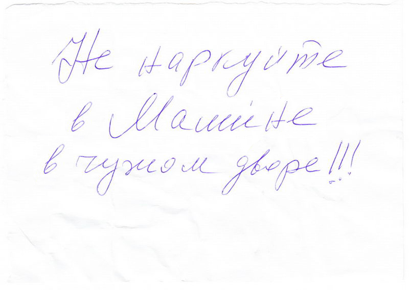 не замарачивайся,....у меня во дворе у половины машин появляются записки такого плана, что пипец! одну запомнил, была под дворником соседа снизу...цитирую дословно "Слыш, Урод! ставь свою любимую возле своего подъезда, а не где попало, иначе увидишь разбитые стекла! потом не удивляйся"... был в шоке.... остальные записки примерно такого же содержания...