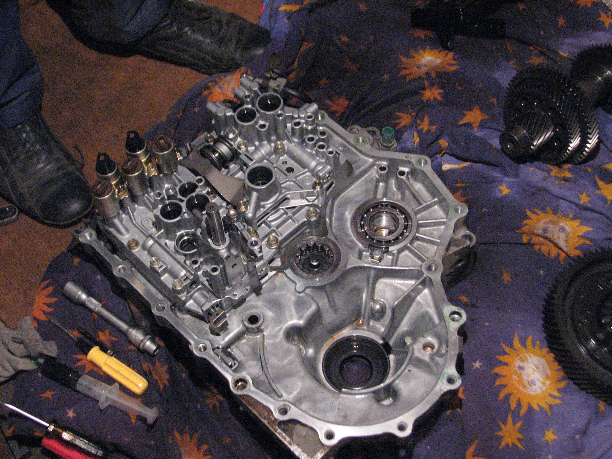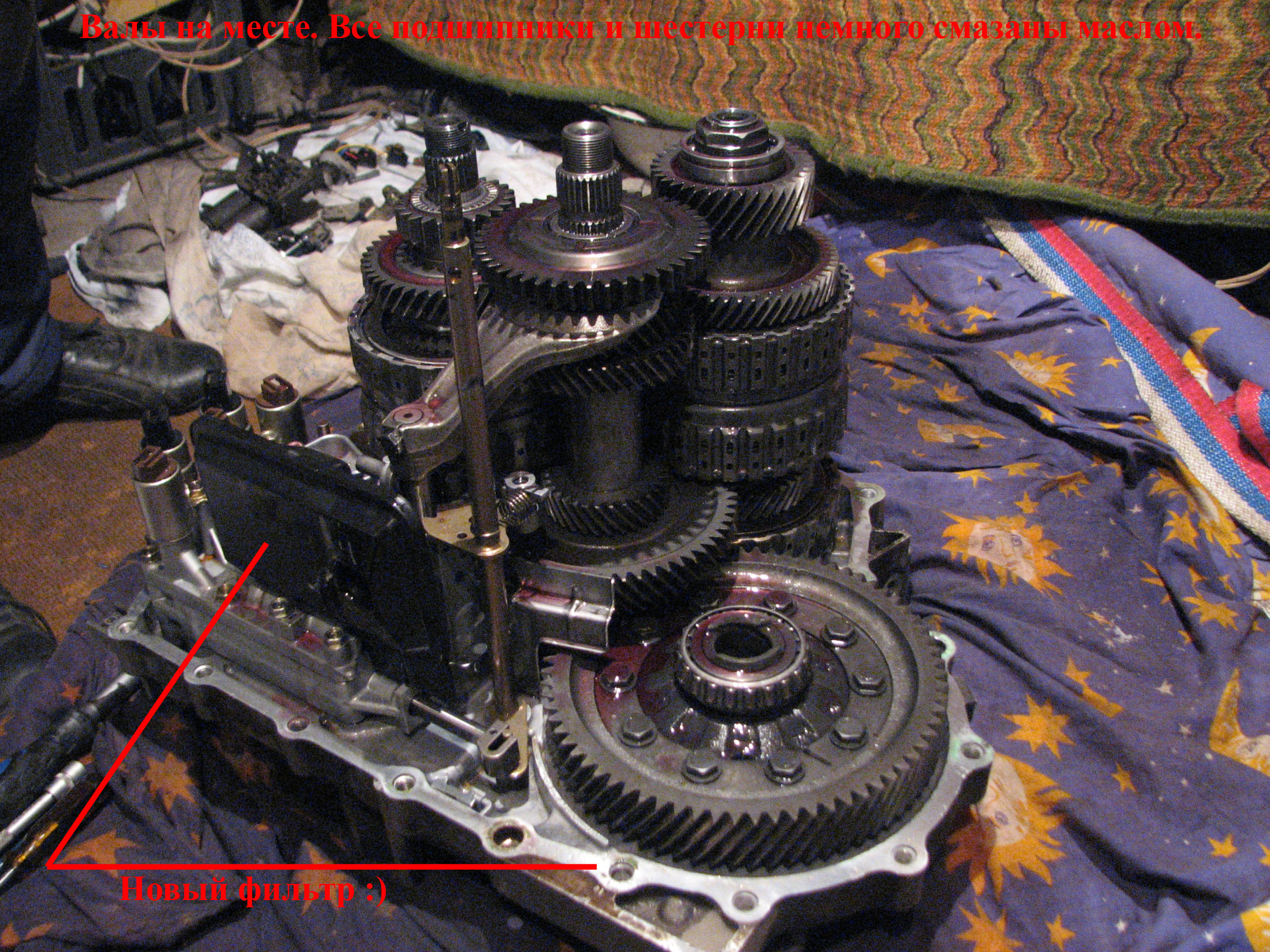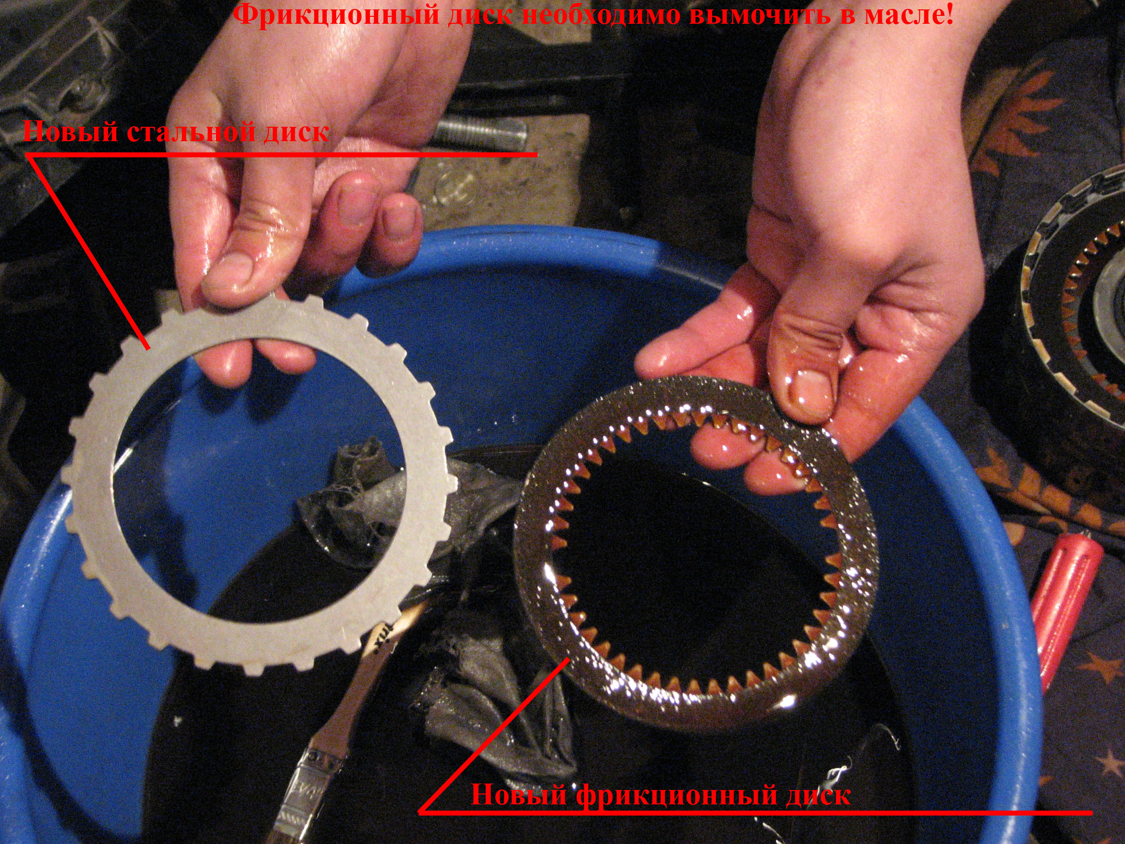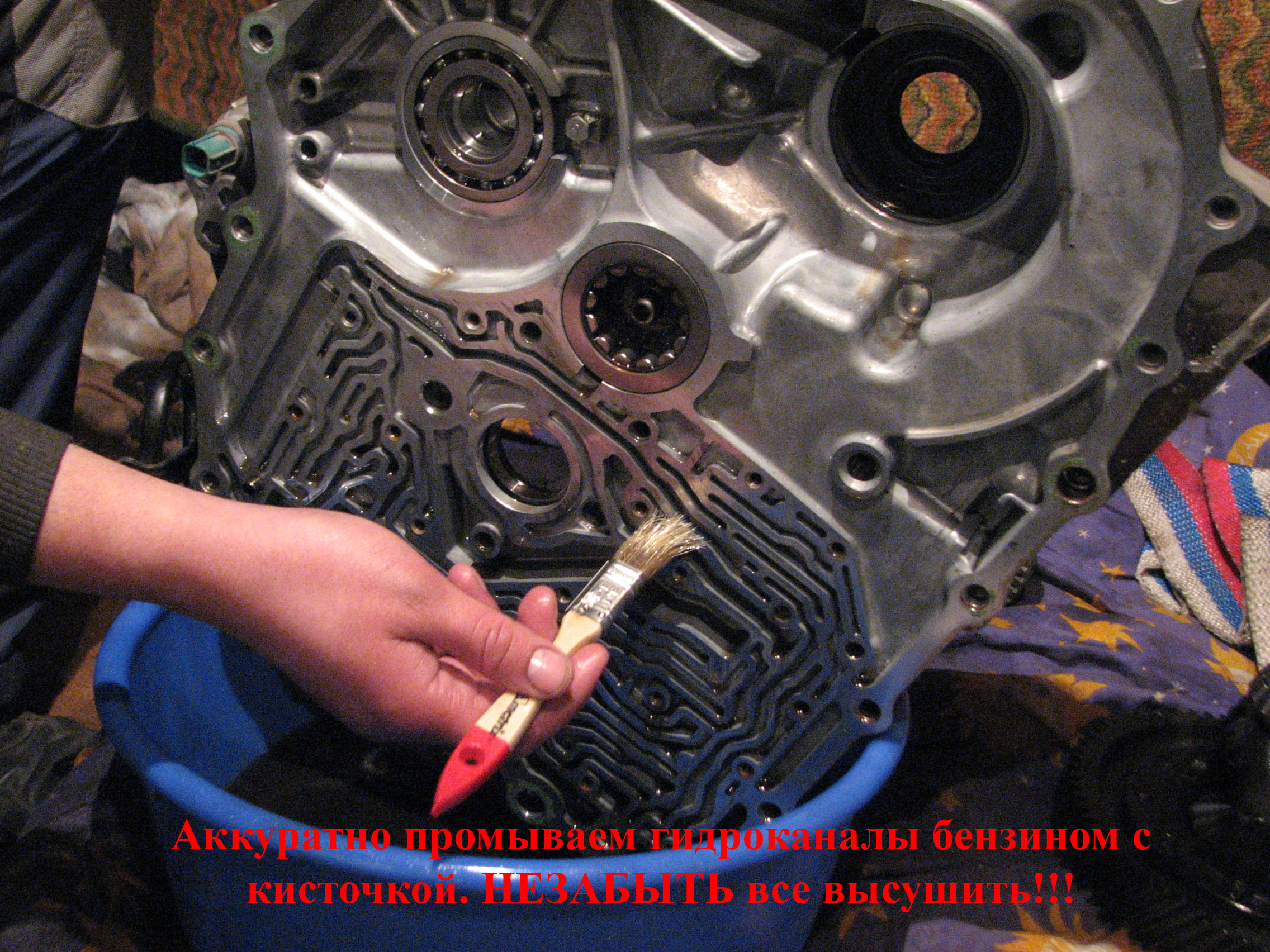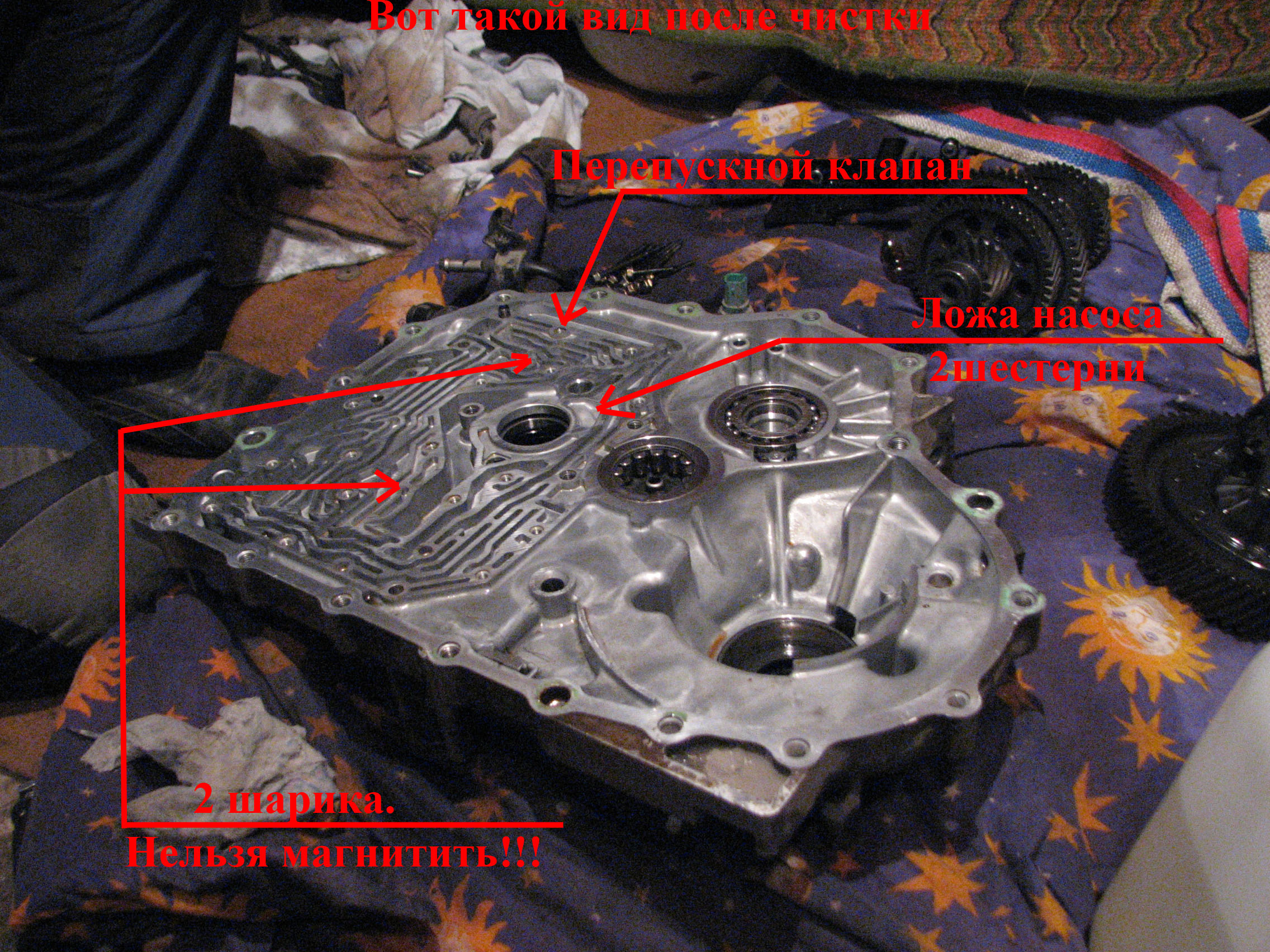 оригинал тут ссылка доступна только зарегистрированным фотографии сейчас мною скачиваются, как сольются - выложу аттаченый архив, уж больно они большого разрешения чтобы пихать их в галерею. ================================================================================ = Всем доброго времени! Начну с предистории. Давненько тут на форуме общались по поводу замены масла на стенде(типа 100%) ссылка доступна только зарегистрированным . Я поменял на стенде, уважаемый man-at-work говорил что не стоит этого делать, мы спорили :smile3: Я утверждал что ничего страшного, он обратное. Снимаю шляпу перед ним, все что он и говорил случилос.... коробка умерла. Как-то осенью хорошенько пооджигав, заметил что при переключении с 1 передачи на 2 происходит пробуксовка (причем только на высоких оборотах). ну чтож смирился - ездил как пенсионер(в таком случае пробуксовка меня не напрягала). Так проездил еще пару месяцев... потом по ощющениям пока едешь плавно газ не давишь машина разгоняется, но стоит резко нажать на педаль - обороты прыгают, а машина не ускоряется.... Однажды решил продемонстрировать данную проблему моему другу. Нажал в пол- а машина еле-еле едет, остановился на светофоре и больше тронуться не смог..... коробка померла Съездил в специализорованный сервис кто занимается ремонтом коробок узнать сколько будет стоить ремонт. Мне озвучили цифру около 50т.р. (со словами что от коробки моей останется только корпус - я подверг сомнению данное утверждение. Потому что если посчитать все НОВЫЕ запчасти для коробки выйдет больше 100т.р). и не понравилось отношение. Контрактную коробку предложили мне за 45т.р. (но это кот в мешке - гарантий того что мне не придется ее заменить даже через месяц нет) Я решился делать сам (опыта раньше не имел никакого). Сразу прошу прощения у бывалых критиков я не мастер писать отчеты и т.п. но все же хочу поделиться. ногами не пинать :smile3: Описывать съем коробки не стану так как это действительно большой геморой! (пусть снимают в сервисе - это стоит своих денег). У меня небыло лебедки чтоб вывесить коробку за уши - кто знает тот поймет что это значит. Снимал с помощью 4х домкратов сначала подрамник, подвеску переднюю, привода, потом коробку (сломал фишку соленоида линейного давления (смог все спаять - но это отдельная история)) Снял коробку, слил масло из коробки и гидротрансформатора (бублик в простонародье) - откачивал шприцем. В масле ничего не обнаружилось ни трухи, ни металической стружки, только сгоревшее черное масло. Внешний осмотр показал что трансформатор в порядке, цвета побежалости металла небыло (от перегрева металл синеет) - отставил в сторону. Начался разбор коробки, снял торцевую крышку пластиковую, под ним разъем к датчику положения(ингибитор если не ошибаюсь). Снимаем разьем, снимаем датчик положения. (На этом этапе фоток небыло). Откручиваем крышку на 10 болтах и видим: [ATTACH]23704[/ATTACH] Снимаем шестерни(парковочную - левая резьба, и шестерню первичного вала), снимаем парковочную собачку, выставляем рычаг переключения с прорезью на корпусе, разжимаем стопорное кольцо вторичного вала (иначе не снимется корпус.) Снимаем крышку соленоидов, снимаем проводку поленоидов и главный клемник. [ATTACH]23714[/ATTACH] Откручиваем 19 болтов по периметру корпуса и снимаем корпус (снимается он с усилием) и дальше видим: [ATTACH]23710[/ATTACH] C промежуточного вала снимаем шестерню, вилку включения задней п