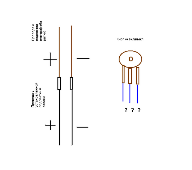 В общем вот какое дело. Сделал подсветку в салоне сзади, но запитал от габариток. На данный момент это мне не совсем удобно, т. к. тонер сзади слабый и в тёмное время суток видно иллюминацию с улицы. Посему хочу поставить отдельно кнопку вкл/вкл на подсветку, купил сегодня саму кнопу - там 3 контакта. Столкнулся с этим первый раз и хз, что и как лепить. Кидать один - и два + на реле или, наоборот, один + и два -?Ниже прилагаю схему)Помидорами гнилыми за исскуство не кидать - т к талант художника в Пайнте зарыт