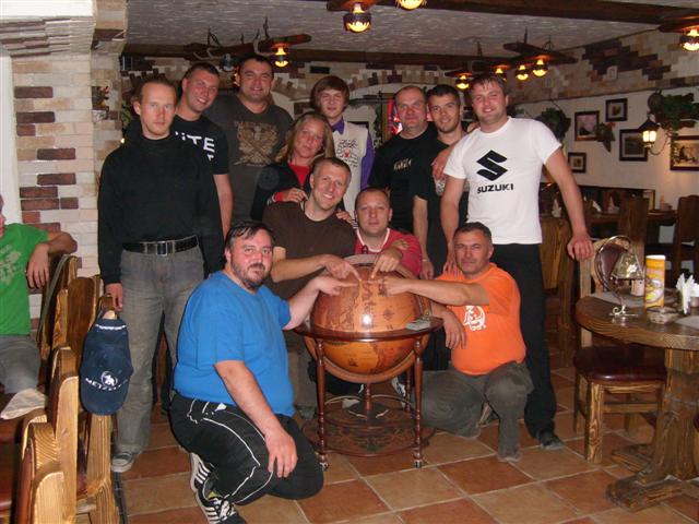 Румын в синей майке внизу напротив меня. "Парочка" (он и она) - это англичане Дениэл и Ребекка. А кроме знакомых вам лиц питерские мотоциклисты.