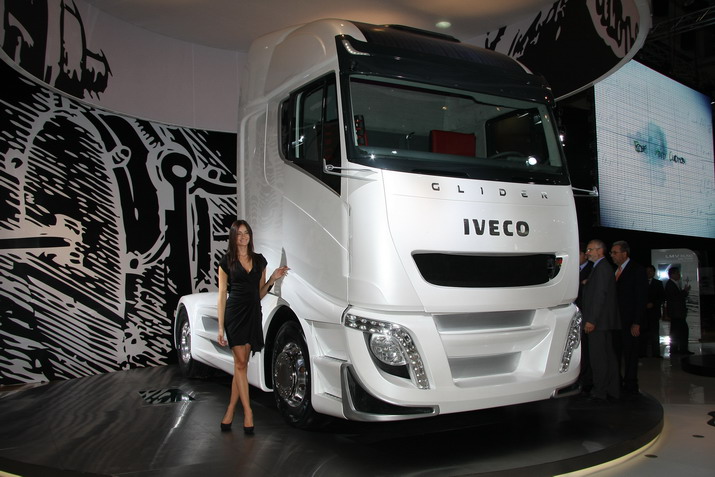 На выставке коммерческой техники IAA 2010 в Ганновере компания IVECO представила концепт Iveco Glider. Будущая серийная модель, разработанная на основе этого концепт-трака, должна прийти на смену современной флагманской модели Stralis. В основу концепта легла идея достижения высокой эффективности эксплуатации, которая, по мнению IVECO, складывается из двух показателей: топливной экономичности и эргономичности. Топливная экономичность достигается за счет использования возобновляемых источников энергии, совершенной конструкции, снижения сопротивления движению и процесса рекуперации энергии. Фотоэлектрические батареи, установленные на крыше автомобиля, способны вырабатывать до 2 кВт мощности и служат дополнительным источником питания. Преобразователи кинетической энергии также берут на себя часть нагрузки и позволяют снизить выброс CO2 на 5%. Энергия, вырабатываемая преобразующими модулями, хранится в баратее емкостью 10 кВтч. Тепло выхлопных газов также преобразуется в полезную энергию с помощью системы, установленной рядом с выпускным трактом. Это нововведение позволяет снизить количество вредных выбросов еще на 10%. Система активных воздухозаборников снижает коэффициент сопротивления воздуха Cx на 8%, за счет чего достигается 1,5% экономия топлива. Двигатель Iveco Glider полностью избавлен от навесного оборудования. Оно приводится в действие отдельным электромотором, который использует проработанный алгоритм сохранения энергии. Благодаря этому удалось также сделать двигатель более компактным и легким. Двухконтурная система охлаждения теперь работает гораздо эффективнее, поскольку на автомобиле установлены специальные модули для отвода избыточного тепла. Автомобиль получил светодиодную оптику, которая потребляет на 70% меньше энергии, чем обычные галогенные лампы. Аэродинамический обвес улучшил показатели сопротивления воздуха на 3%. Полуприцеп крепится к активному седлу, которое самостоятельно регулирует расстояние до кабины в зависимости от дорожных условий. Кроме этого, от качества дорожного покрытия зависит и давление в шинах, которое задается отдельным модулем. Эргономика, являясь второй составляющей идеологии «высокой продуктивности», основана на принципе «Дорога-Офис-Дом». Это означает, что внутреннее пространство кабины трансформируется для достижения максимального комфорта водителя в зависимости от решаемых задач. Вращающиеся сиденья оборудованы откидными спинками и подставкой для ног, а второе спальное место регулируется по высоте. Переносной многофункциональный дисплей диагональю 15 дюймов может быть установлен на центральной консоли, в пассажирской зоне или на задней панели кабины. Диодное «Full-LED» освещение кабины позволяет создать уют на время стоянки и подобрать оптимальный режим для движения в ночное время суток. Водителю также предлагается высококачественная аудиосистема с объемным звучанием, большое количество отсеков для хранения вещей и инновационный климат-контроль, регулирующий параметры температуры, влажности и чистоты воздуха в кабине. Сообщение отредактировал Fluke - 8.12.2010, 3:10 -------------------- Я за любой кипиш кроме голодовки!