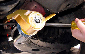 Установка и тестирование понижающего набора В прошлый раз мы уже установили задний регулируемый стабилизатор на наш WRX 1994 года, а также отрегурировали давление шин и выставили правильные сход/развал. Все это привело к заметному улучшению управляемости. Наибольшее изменение произошло в снижении недостаточной поворачиваемости в среднескоростных поворотах. Фактически же, если постараться подвеска стала более склонной к избыточной поворачиваемости. Пора начинать искать баланс. В набор входят заменители крепления для передних управляющих рычагов, с относительно жесткими втулками. Крепления сконстроированы таким образом, чтобы собирать и перераспределять угол продольного наклона, а жесткость втулок способствует снижению колебаний при прохождении поворотов. В случае с нашем WRX (на котором передняя подвеска это стойки MacPherson) угол продольного наклона - это угол отклонения передней подвески от вертикали. Преимущества дополнительного отклонениям это больший угол развала колес при поворотах, получается как бы "динамический" развал. Компания "Whiteline" уверяла нас что их набор добавляет дополнительных 0.5 градуса к развалу в неподвижном состоянии, и вплоть до 1 градуса при прохождении поворотов. Снижение люфтов в соединениях (в сравнениею с заводскими втулками) - это как раз одна из причин для создания большего развала. Не так давно, компания "Whiteline" представила 3 новых разновидности своего набора, которые имеют одинаковые по форме детали, но отличаются жесткостью соединителей. Наиболее мягкая вариация носит название "Comfort", в нее входят втулки "70 Duro", а две другие версии используют соотвественно "80" и "95 Duro", последние применяются в версии "MotorSport". На нашу WRX мы выбрали версию "Comfort", так как нам бы хотелось оставить машину достаточно комфортной, так как она используется для ежедневных поездок. Номер по каталогу "KCA361", стоимость приблизительно 200 долларов. Геометрия занижения Итак, прежде чем перейти к дальнейшим вопросам, давайте выясним действительно ли получается занижение? Принимая во внимание, расположение центра тяжести, колесную базу, процент момента на передних колесах и процент торможения передом, мы можем сказать что занижение действительно чувствуется, и "кренов" и "клевков" становится меньше. Виртуально - они сократились до нуля! Если Вас интересуют подробности, обратитесь к материалам на сайте компании "Whiteline" Установка Сама установка, так же как и установка заднего регулируемого стабилизатора в прошлый раз, не заняла много времени. Всего мы потратили около 2-х часов. Итак, после того, как машина поднята и надежна закреплена, снимаем один из заводских управляющих рачагов (все равно какой, левый или правый). Ослабляем 22мм гайку, не снимаем ее полностью! Вам потребуется рожковый ключ. Затем, снимаем 2 20мм болта, которые крепят рычаг к кузову. Самый простой способ снять рычаг - это воспользоваться отверткой небольшого диаметра, вставьте ее в отверстие, и используйте как рычаг. Как только рычаг удален, очистите точки соприкосновения от грязи. Это продлит жизнь втулок, и уменьшит вероятность появления посторонних звуков. Крепежка Рассматривая входящие в набор соединители, мы обратили внимания что они сделаны из качественного легкого сплава. Левый и правый соединители имеют разную маркировку. Смажьте втулки специальной смазкой. Убед