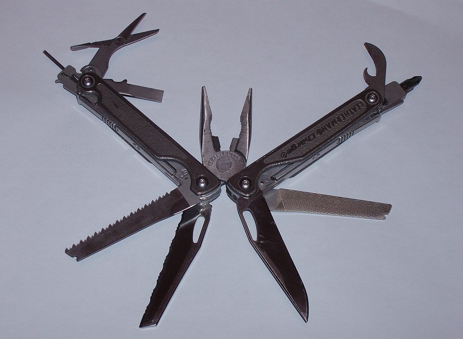 В хвост и в гриву использую мультитул лезерман ти чардж: обычное и серрейторное лезвие, пила, напильник крупный и мелкий, отвертка большая плоская, отвертка крестовая и малая (биты), открывашка для консервов, ножницы, кусачки, пассатижи.