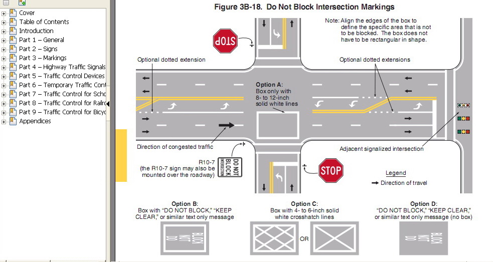 Секция 3B.17 страницы 382 у них называется Do Not Block Intersection Markings (разметка Не блокировать ... что-то типа этого). В ней указывается: Do Not Block Intersection markings may be used to mark the edges of an intersection area that is in close proximity to a signalized intersection, railroad crossing, or other nearby traffc control that might cause vehicles to stop within the intersection and impede other traffc entering the intersection. If authorized by law, Do Not Block Intersection markings with appropriate signs may also be used at other locations. Смысл в том, что данная разметка может быть применена для обозначения границ области перекрестка, из которой затруднена видимость средств регулирования перекрестка, рельсовых путей или иных участников движения, что может вызвать остановку и препятствование проезду. В соответствии с законом эта разметка в сочетании со знаками может использоваться и на других участках дороги. Дальше идет: Standard: If used, Do Not Block Intersection markings (see Figure 3B-18) shall consist of one of the following alternatives: A. Wide solid white lines that outline the intersection area that vehicles must not block; B. Wide solid white lines that outline the intersection area that vehicles must not block and a white word message such as DO NOT BLOCK or KEEP CLEAR; C. Wide solid white lines that outline the intersection area that vehicles must not block and white cross-hatching within the intersection area; or D. A white word message, such as DO NOT BLOCK or KEEP CLEAR, within the intersection area that vehicles must not block. Обычно: "Не блокировать" используется с одним из вариантов: A. Широкие сплошные белые линии, определяющие область пересечения, которую не должны блокировать ТС; B. Широкие сплошные белые линии, определяющие область пересечения и белый текст с сообщением, таких как DO NOT BLOCK и KEEP CLEAR; C. Широкие сплошные белые линии, определяющие область пересечения и белой штриховкой в районе перекрестка; или D. Белый текст сообщения, например, DO NOT BLOCK и KEEP CLEAR, в районе пересечения. Вот и оно!!! Поскольку по разным штатам правила варьируются, то Калифорния сочла достаточным писАть одно слово CLEAR. Так что прав оказался Голландец, который узрел трамвайные пути. Ну, и я маленько, что узрел проезд на дорогу с плохой обзорностью... именно выезд с нее и ограничен сплошными и соотв. надписью. Из-за подъема водиле тупо не видно кто где на перекрестке, поэтому приходится высовываться на него дальше. Чтобы урюки не бабахнули его в бочину - там и размечен таким макаром перекресток. Спасибо! — KAMAZ