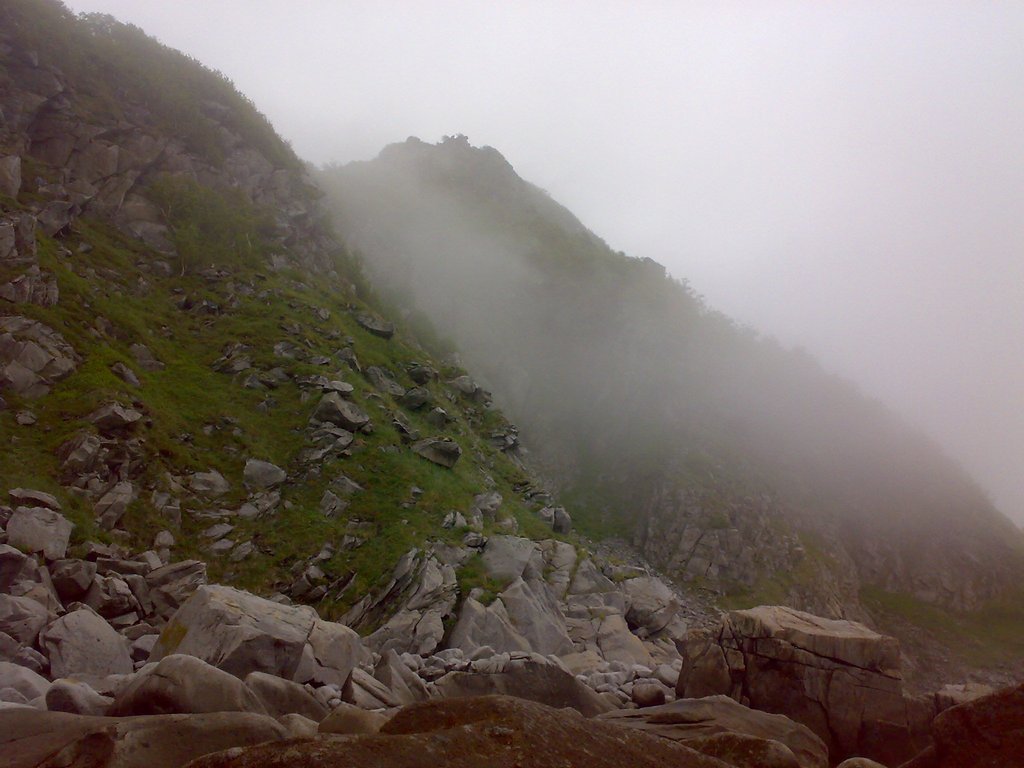 Спуск - теоретически только... Там нет растительности, только травянистые склоны очень крутые... Хотя по левой стороне (если лицом к морю) есть разрезик, может там и была верёвка, про которую вроде слышал... Voldemar, Вот верёвка как раз от половины тропы вниз на Берёзовый. Ниже и правее "городка", от серкинского креста, выложенного из камней на песчаном склоне. Леш, крест вы видели? Voldemar, снимок "городка" - хорошая панорамка, только с масштабом что-то странное, или мне кажется? А по по мокрой траве по крутому склону метров на 500-700 правее тропы пришлось как то ехать на попе. Благо на спине был большой рюкзак - выручил. Шли на Чирикова, но из-за густого тумана решили спуститься на берег. Было мокро, быстро, весело и больно ... потом. От спуска по верёвке направо на берегу под склоном домик стоит. Цел ещё? -------------------- Для бешеной собаки пятнадцать километров - не крюк...