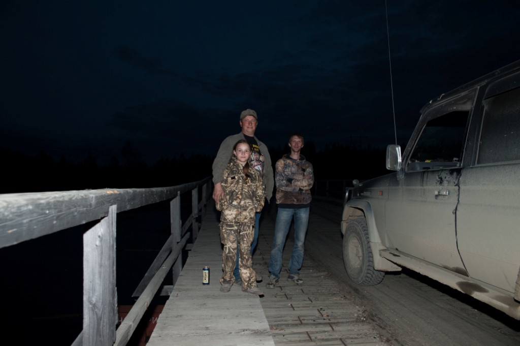 С чего начать... Ну наверное с еще раз высказать благодарность Сергею из Ягодного за спасение нашей экспедиции из так бездарно встрявшей на ровном месте и приложить фото Сергея, его дочурки, моего железного друга ну и меня соответственно, Ну что сказать о дороге, ничего страшного пока нет, обычная плохая грунтовка с ямами полными воды. Поднялся на бугорок - спустился в ямку с водой, поднялся на бугорок, по началу думали каждую лужу мерять, но когда поняли что они через каждые 50 метров, решили только те мерять, что наиболее опасными кажутся. Так мы и ехали первые 16 км. Реально опасным было только одно место, дорога идет вперед прямо в небольшую лужу, но почему-то в право идет через бугры другая объездная дорожка, бугорки и правда крутые, можно легко днищем терануться, подумав, решил что в воду не хочу, буду скакать по буйракам(как оказалось в дальнейшем, после общения с местными водителями, решение было абсолютно верным, в этой маленькой луже Камазы вязнут на ура....), так мы и добрались до ручья Красный, штурман в это время уже монотонно посапывал на бугорках (хорошо ему, пивко освежающее в дороге видимо притомило). Итак, мы подъехали к ручью Красный. С виду маленький, разлившийся ручеек, таковым он и оказался. Прошли его не меряя и не напрягаясь и двинулись дальше. Дорога все такая же, грунтовка с ямами полными воды, объезда нет, с боков тундра, только вперед.... По рассказу Сергея на 21-м км серьезный брод, надо быть аккуратно, вот и мы где-то рядом,выезжаю на очередной бугор и вижу эту речушку, и какой-то темный силуэт на берегу. Первая мысль - "МЕДВЕДЬ".... Подъезжаю ближе и вижу за бугорком костерок, медведи костры пока еще не научились разжигать, подъехав еще ближе различил человеческую фигуру ремонтирующую велосипед. Остановился, вышел поговорил с мужиком, оказывается Виктор из Ягодного с велосипедом держит курс на озеро рыбки половить.... А говорили что я "экстремал", камеру ремонтирует, да чаек разогревает чтоб погреться да взбодриться, шутка ли 21 км. велосипед на себе тащить!!!!! У нас машина полная бутора, реально только два человека поместятся, спереди. Поговорили и говорю ему: "Извини мол, взяли б тебя, но в машине места нет, да еще и с велосипедом.". Он кивнул головой и пошел чай пить, ну а я толкнул штурмана и пошли брод мерять. Там глубоко, там глубоко, там каменюки большие, сяду на них. Ходили, меряли смотрели, но надо и дальше двигаться.... Решил идти тут, между валунами проскакивать. Штурман в воде, дорогу смотрит, я в машине газую. Потихоньку тронулись, путаюсь лавировать между валунами под водой, что-то чиркнул передним мостом.... и чувствую машина уже не едет, она плывет, нос течением поворачивает..... и тут из под заднего моста легкий скрежет, машинка наклонилась на правую сторону и нос еще сельнее течением повернуло и новый скрежет со стороны переднего моста..... СИДИМ... Вышел, посмотрел где что и как сидит, как крутится... Едем дальше, говорили что на 36-км будет еще засадные места. Ну так оно и есть. Лужи глубже, объезда нет, дно илистое. Встречаются ручейки с крутыми берегами и камушками размером с пару шлакоблоков. Догоняем Виктора с велосипедом, помахали друг другу ручками, про себя думаю: "Ну не прав я, в глухой тайге человека не подобрать. Ну он же местный, знает куда идет и что делает.". Пройдено примерно 36 км. из 54-х до озера. Едем дальше, очередная очень 