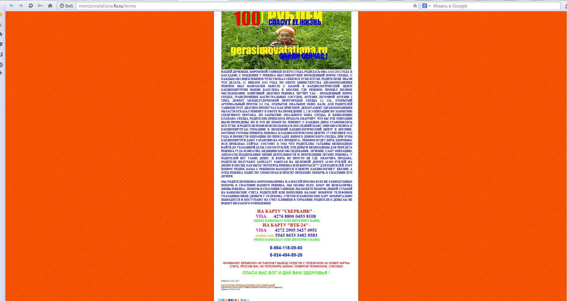 Добрый день Магаданцы.К вам едут на гастроли мошейники.История у них одна: "Ребёнку 2х лет требуется срочная операция в Берлине.Диагноз порок сердца" Собирают по три миллиона.Это всё ложь!!!! Вот вам ссылки на наш Сахалинский форум,где всё описанно.Распространите информацию и не давайте им денег.У нас они под фамилией Герасимовы были,у вас под Морозовыми.Они открывают сайт и не жалеют денег на рекламы,съёмное жильё.Докуметы все липовые.И лично их не видел никто. Вот вам ссылки ссылка доступна только зарегистрированным и ссылка доступна только зарегистрированным спасибо за внимае,надеюсь обманутых будет меньше.