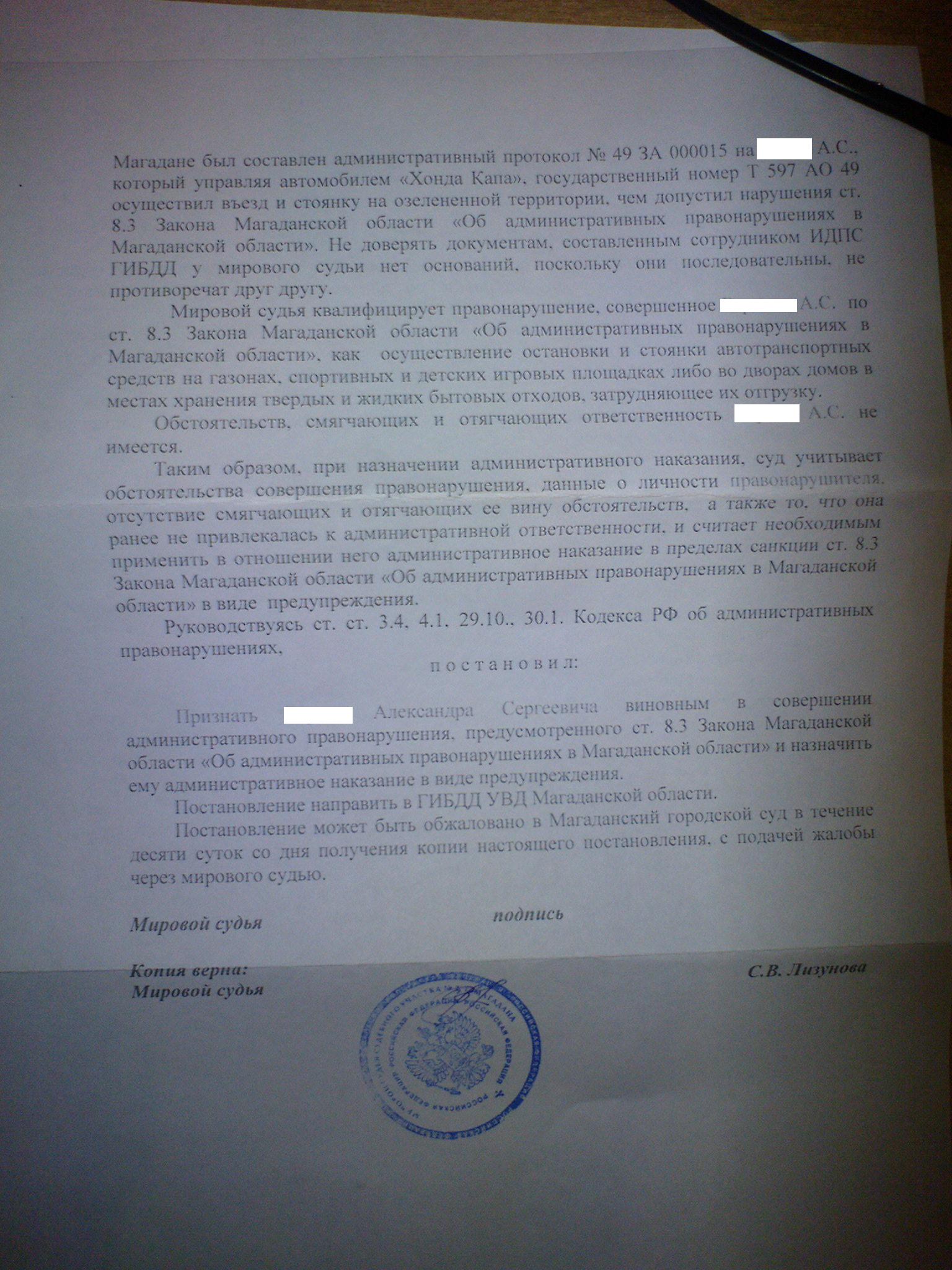 -ну вот видите деревья стоят. -я же не на дерево заехал... - ну все равно типа газон... выписывает мне протокол в котором пишет - произвел стоянку на озелененной территории я написал что " из-за отсутствия расчищенных парковочных мест по указанному адресу, пришлось припарковать авто под окном дома в накатанной колее. с нарушением не согласен." на мой вопрос а что будут делать с машинами которые были припаркованны рядом с моей, дядька пообещал "будем выявлять..." обидно встал на 10 мин человека подождать, приехали блин вопрос к нашим юристам какие шансы что меня неоштрафуют? -------------------- |