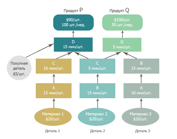 Представьте, что вы управляете заводом! Пред Вами встаёт обычная управленческая задача. (Нет, нет, яхты, шлюхи и блэкджек никуда не делись, но это потом... А сейчас - работать!) Предположим что наш завод - идеален. То есть он лишен какой-либо неопределенности и проблем. Все работает идеально, у нас есть вся необходимая информация. Сможем ли мы теперь точно ответить, сколько прибыли заработает наш завод на следующей неделе? Условия задачи. Наш идеальный завод выпускает два продукта: P и Q. Дефектов — ноль. Планово-предупредительных ремонтов нет. Время переналадки оборудования равно нулю. Отпускные цены на наши продукты жестко зафиксированы: продукт Р стоит $90 за 1 штуку, и Q стоит $100 за 1 штуку. Абсолютно точно известно, что рынок готов у нас купить 100 штук P и 50 штук Q в неделю. Схема производства продуктов представлена на рисунке. На нашем заводе у нас имеется по одному работнику каждого типа A, B, C и D, и они абсолютно не взаимозаменяемы. Каждый рабочий доступен 5 дней в неделю, 8 часов в день, 60 минут в час. Или 2400 минут в неделю. Простоев нет. Операционные расходы составляют $6000 в неделю и включают зарплату рабочих, продавцов, управленческого персонала и деньги, которые мы платим за электроэнергию, банковский кредит и т.д. В операционные расходы не входят затраты на материалы и покупные детали. Количество известно, цена каждого материала ($20) и покупной детали ($5) известна. Итак, вопрос: «Какую максимальную прибыль (или убыток) может заработать компания за неделю?». Попробуйте найти время и решить эту задачу самостоятельно. -------------------- «Ад и рай – в небесах», - утверждают ханжи.