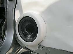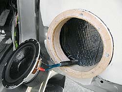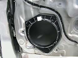 Установка мидбаса и твитеров получилась достаточно стандартная, без изысков. Для НЧ-динамиков были взяты 40-миллиметровые кольца, толщина которых позволяла без помех опускать боковые стёкла. Восемь шурупов держат кольцо на двери, а четыре - крепят динамик к кольцу, все стыки промазаны герметиком. В итоге получилась жесткая, полностью герметичная конструкция, без каких-либо посторонних призвуков. Чтобы исключить уход звука под обшивку двери, динамик вместе с фанерной проставкой был обклеен сплэном, а затем битопластом. В итоге между корзиной и обшивкой получился своебразный мини-тоннель.