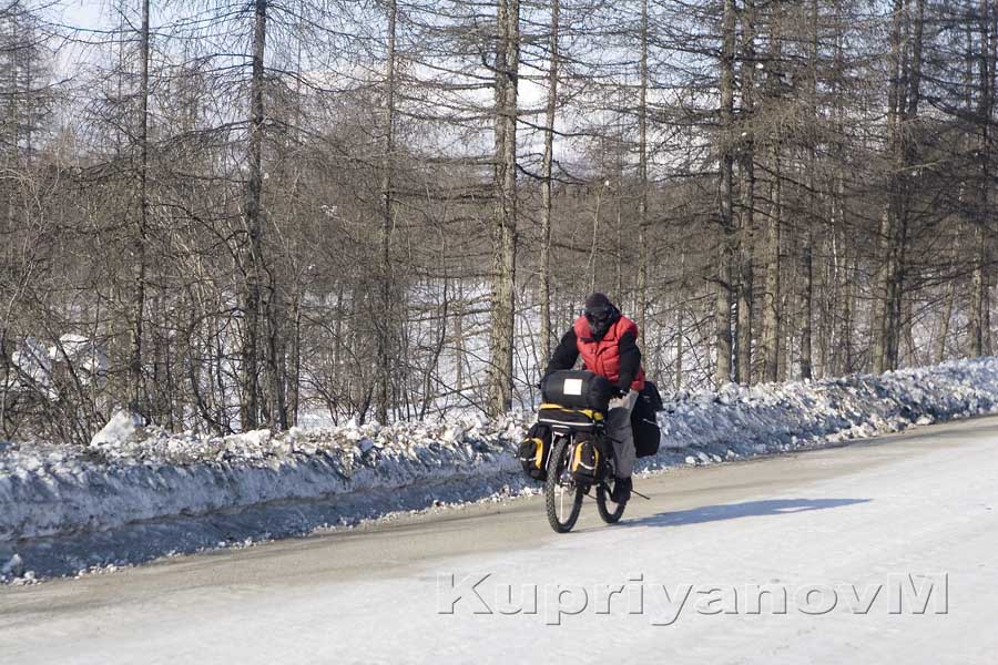 Сегодня. Утром и ближе к вечеру. Второй раз у дебинского моста остановились, поинтересовались. Велопробег Якутск-Магадан-Якутск. Одиночка. 18 дней в пути. 11 ночёвок в палатке. В Якутии застал -40С. Туда - по основной, обратно по "Теньке". Надеется успеть до вскрытия рек. Пожелали удачи. Думаю, дней через пять-шесть будет в городе. |