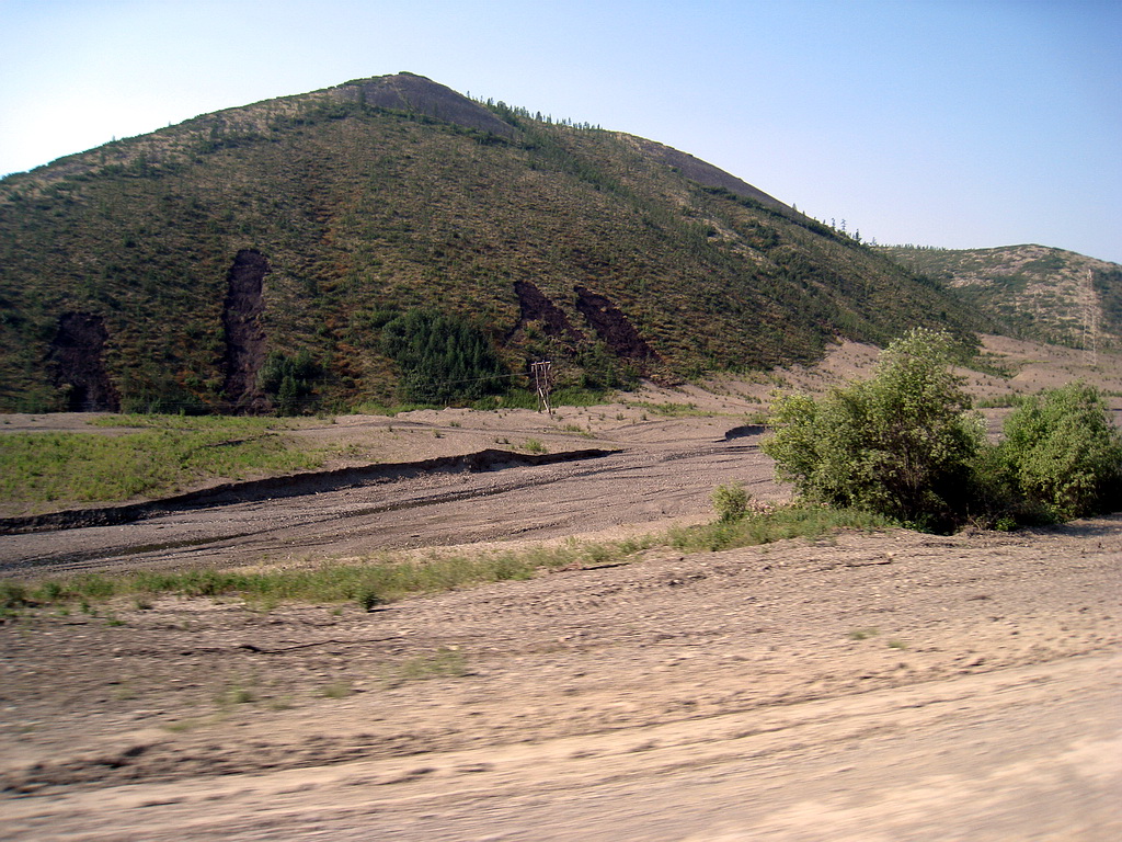 Маленькое отступление. Меня тут попросили описать что я брал с собой… и что пригодилось, не пригодилось. Список снаряжения: Автомобильное: -Масло -Запасные колеса (два, у кого японская резина – рекомендую три или поменять на жесткую резину- оптимально – российского производства – для джипа рекомендую BF Goodrich AT. Вопреки всем предсказаниям – грыжами не изошел) -Тосол - набор инструментов - два воздушных фильтра - топливный фильтр (не пригодился, но быть должен) - канистра - набор для ремонта камер - монтажки - кувалдочка - трос - ручная лебедка - ручные рации с автозарядкой. (очень очень удобно когда идешь в спарке). Вот в принципе и все. Рекомендую взять клеммы для аккума (мне понадобились в глуши, масляный фильтр – там куда вы едите, его может не быть. Туристическое: -Спальники -Одеяло -Топорик - Сапоги - продукты на 3-4 дня (можно зависнуть, так что не лишние) - складные стулья - стол (я не брал, но пригодиться) - палатка - котелок - ложки, миски - тренога для костра Из туристического пригодилось все. Если что вспомню – еще напишу.. на самом деле подробный список снаряги у меня на работе – я его потом файлом прикреплю. Ладно, продолжаю рассказ. С утра встали, попили кофе, налили его запас в термос… день предостоял быть весьма жарким – так как в 10 утра – пекло во всю… люди – делайте кондиционеры для длительных путешествий – я не сделал – о чем горько жалел всю дорогу. Обязательная проверка машин, выравнивание давления в колесах, проверка уровня масла, проверка тосола. Стартовали в 10:27, а в 11:13 проехали поселок Бурхала. Там кто-то подрал сопку: и начали подниматься в бурхалинский перевал: Это субарик там за мной поднимается %). В общем, на подъеме я начал греться – жара стояла под сорок, плюс постоянная работа двигателя… Надо сказать, что по возвращению перегревы на подъемах стали очень частой проблемой… сейчас буду с ними бороться. Но на перевал забрались, стрелка в красный сектор не переместилась… включил печки открыл окна капот, и стал ждать. Пока ждали –поделали фото, но они конечно не отражают всю красоту бурхалинсокго перевала. Субарик: Сафарик: Подоостыли, поехали дальше… И вот мой родной город Сусуман в котором я прожил 15 лет. Заезжаем на заправку (дальше заправка только в Усть-Нере, если не заезжать на мяунджу) я беру деньги иду расплачиваться за топливо, рассчитываюсь, подхожу к колонке, включаю ее и «ЕМАНА», соляра начинает литься куда угодно, но только не в бак… она льется на меня, на машину, на землю, но только не в бак.. мать ее… это научило меня включать колонку только после вставки пистолета в бак… кое – как справившись с мутным потоком живительной для автомобиля, но крайне вонючей и неприятной для меня жидкости я переоделся и пошел доплачивать за соляру.Так сказать провел сеанс эксгибиционизма для девочек работающих на колонке. Одежду не испортил, но выстирать ее толком удалось только в Якутске. до этого в салоне стоял стойкий запах соляры. Благо это не бензин- терпеть можно. Заправившись (32 литра по 25 рублей - 800 рублей. Обратите внимание – в сусумане соляра дешевле чем в ягодном – это все гримасы капитализма – в сусумане на въезде со стороны Магадана – заправка частная – там дешевле всего) поехали смотреть техноген! Это не глумление сусуманцев над пиндосами (11 сентября).. Проихождение сего памятника просто – в свое время Сусуманский ГОК 