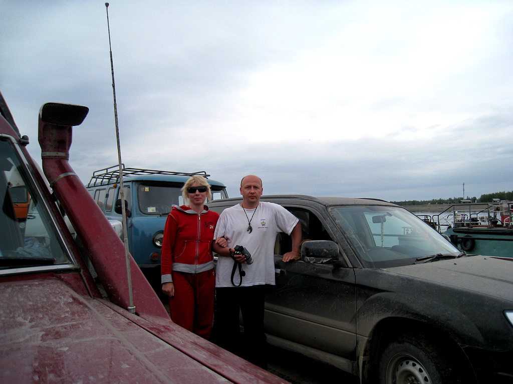 День 5й. Теплый ключ – Нижний Бестях – Якутск. Встали рано – в 6 утра. Позавтракали, и сразу в путь - в надежде попасть на утренний паром.. Нас предупредили, что на паромах порядка никакого, поэтому надо не зевать и быть понаглее.. с теми мыслями и поехали. Дорога была неплохая, только уж очень много щебня на нее насыпали… поэтому машина – не ехала а плыла по щебенке. Приходилось из за заднего привода – иногда ее подлавливать. По хорошему скорость там можно было держать не более 60, но из – за спешки на паром – летели под 80… это мне потом и вылилось… тряска была сильная.. подвеска хрустела, но автомобиль ехал… приехали в хандыгу – проскочили по главной улице, своротов на паром не увидели – ладно – едем дальше, искать паром… Пролетаем указатель на Кэскил- дорога не на сворот – лучше гораздо, быстро проезжаем толи протоку Алдана, то ли озеро и выезжаем на берег. Опппа… ни машин, ни людей, ни подобия пристани нет… млин.. по реке идет паром и идет он явно не туда где мы стоим.. разворачиваемся – и в Кэскил… Это национальный якутский поселок, въезжаем в него – навстречу бежит якут и машет руками – мол вам не сюда, ладно разворачиваемся и между поселком и рекой выходим на какое то подобие пристани – стоят моторные лодки, пара уазиков-буханок ходят люди… всатли – ждем… подходит якут – говорит – неа – на паром надо было налево от поселка а потом по берегу направо.. ну е-мае.. причем все это в спешке – что бы успеть на утренний паром, день терять не хочеться.. в общем не жалея машин полетели по указанному адресу. Наконец то нашли….. машин вроде немного, должны влезть без особой наглости… между тем паромчик почти дочапал до берега и начал приставать. Наш паром – это «Ермак» справа Выгрузив пришедших с той стороны… начали принимать машины… мы считаем – вроде попадаем оба… и действительно, последний загрузился уазик, который стоял за нами. Все было по порядку и по очереди – вопреки слухам (ха-ха, наивные русские люди, как мы ошибались).. %) В общем тронулись. Переправа джипа стоила 1300 рублей, Сашиного субарика – 1200. плюс пассажир – сто рублей с него и с меня. Самая дорогая переправа за время следования. Переправились.. выгрузились.. и решили ехать дальше, предварительно пропустив другие машины, что бы не глотать за ними пыль.. надо сказать – весьма мудрое решение было. Так как грунты здесь совсем другие, пыль очень мелкодисперсная, и очень- очень плотная. Стоит долго… ни хрена не видно.. ехать надо промежутком в 2-3 километра между машинами. Подождали, поехали. Дорога эта новая, построена так же недавно.. ибо раньше паром ходил до Мегино-Алдана (бывалые, поправте меня, если ошибся) и туда он шел 8 часов, обратно вврех по течению 1,5 суток. А тут все таки по дороге.. Проехали километров 70 и началаи попадаться вот такие штуки: Мы так поняли, что это каркасы для чумов.. Дорога стала глиняной, но поливать по ней можно было спокойно – видать недавно грейдировали. По дороге попадались трактора с набитимыи внутрь и снаружи местными жителями.. едут по 5-8 человек в одном тракторе, я так понимаю в гости, ибо в тот день когда мы там проезжали – у них был национальный праздник Ысыах. В этот день они все ездиют в гости, пьют водку, катаются на лошадях и вообще радуются жизни. Отдельно надо сказать про буханки- Уазики. Эти автомобили здесь очень популярны.. просто- таки неимоверно их