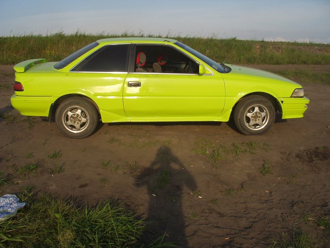 Привет всем посетителям этого замечательного сайта. Это второй мой отзыв, первый был о Тойоте Спринтер 96 г. 1,5 МКПП. Спринтер был взят с отцом на двоих, когда зашла речь о покупке Марк2 90 кузов, я выбрал вариант покупки отдельной машины, хотя Марк был и остается маленькой мечтой. Ну так вот располагая определенной суммой был найден Левин, историю поиска описывать не буду, долго. Итак имеем Тойота Левин 1987г.в. ДВС контрактный 1995г. поставлен в 2007г. 1,6 5А карб. , АКПП (хотел МКПП но выбора не было), бит по «кругу», не удивительно все таки 87 г., нужно было красить левую сторону переда, менять поворотники, Двс и Акпп нормальные, по подвеске - под замену передние стойки, в остальном все в порядке, комплектация самая простая. Конечно первое впечатление произвел цвет машины, сразу бросается в глаза. Машина конечно далеко не идеал, но выбор не велик, да и чем то задела, бывает ведь, смотрел ее два раза и решился. После покупки сразу заменил масло в движке, залил ENEOS 10W/40, в коробке не трогал, бывший владелец говорил о недавней замене, да и внешний вид масла не вызывал подозрения, поменял воздушный и топливный фильтр, свечи. Купил передние стойки, т.к. финансы были ограничены приобрел TOKIKO, о чем вскоре пожалел… не отъездив и месяц застучали, до сегодняшнего дня езжу на них. Поставил на учет и поехал на тех. осмотр, его нужно было продлить, а там сказали, едь перекрашивай, в ПТС цвет желтый, на самом деле салатный, но машина до меня проходила тех. осмотр, не стали слушать и уперлись. Перед покраской поработал над бампером, заделал монтажной пеной места для поворотников, т.к. они отсутствовали и найти их очень трудно, слева была трещина, стянул пластиной, посадив ее на саморезы. Поехал перекрашивать выбрал желтый перламутр, маляр (женщина) красила три недели, ну думаю, заберу машину красота получится…х»е»р то там (по-другому не скажешь) ужас. Забирал вечером, не обратил внимания, а на следующий день пипец, очень много косяков, за такое говорят: «Руки оторвать надо». Поехал обратно, говорю, давай переделывай, а она мне нет, мол, того, что я тебе машину и так почти даром покрасила, она у меня первый раз облезла и я краску докупала на свои деньги так что делать не буду, я говорю ты мастер знала что делаешь, ладно говорю я покупаю краску делаешь бесплатно, нет разворачивается и уходит. Я как дурак стою, да и что я сделаю, не возьму ведь за шкварник, ей под 50 лет, плюнул, уехал, в суд подавать документов свидетельствующих о покраске нет. Всем: «Не повторяйте таких глупых ошибок как я». Начал приводить машину в «более менее» надлежащее состояние. Купил новые поворотники, привезли от короллы вроде 91 кузов не подошли, т.к. родные стоили около 2 т.р. за 1шт. и ждать их нужно было больше месяца, решил переделывать эти, помогли мне в этом знакомые Женька и Виталя за что им огромное спасибо. По форме немного другие, получились промежутки около крыла и бампера закрыл резинками, все получше будет. Также купил передние подкрылки от короллы, т.к. на левой стороне не было локера, немного подрезал, все нормально встало. Днище багажника обработал битумной мастикой. Следующим шагом стала тонировка, вкруг 5-ой, лобовое 20-ой, по-поводу лба перестарались темновато ночью, во время операции анти- тонировка штрафанули – содрал, все равно собирался переклеивать. Временно наклеили полосу, после окончания операции