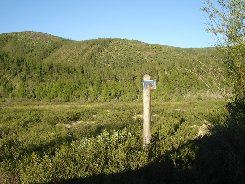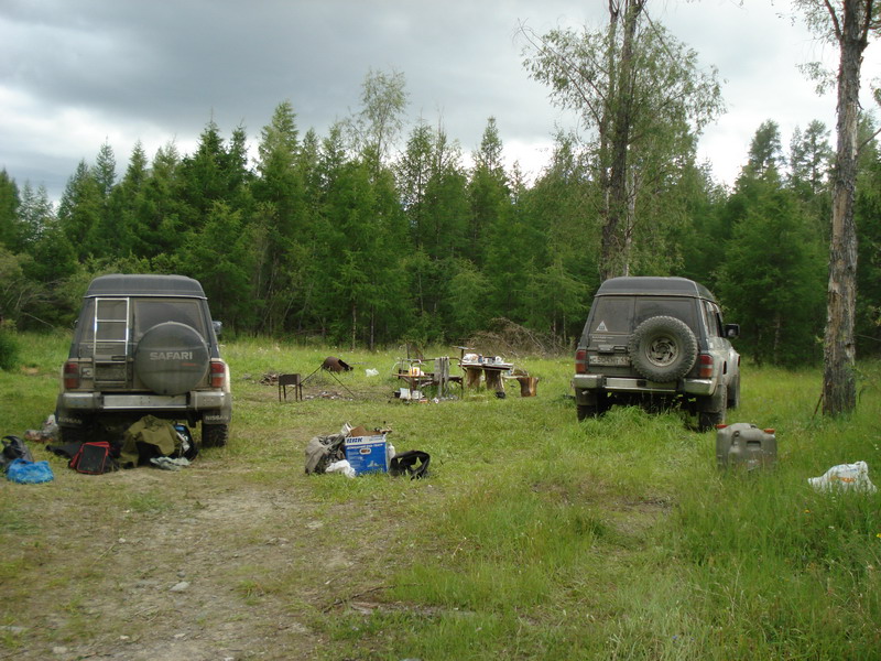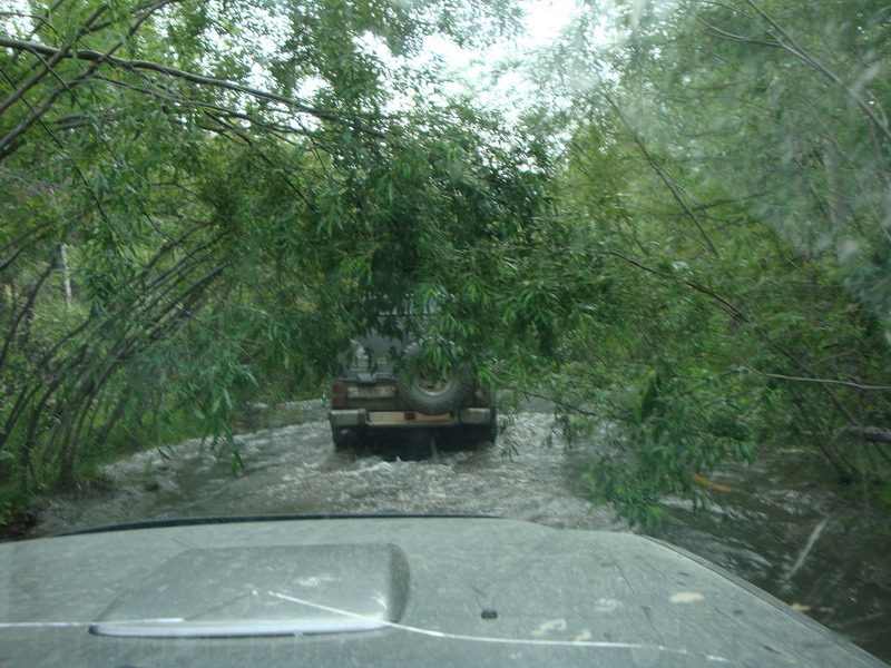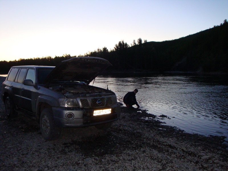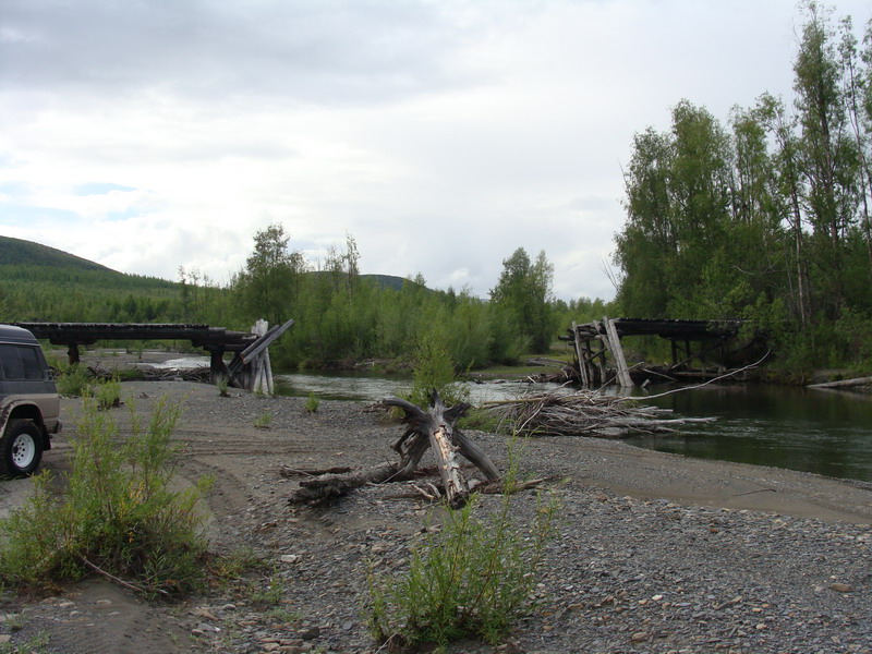 Выдвинулись из города в понедельник 12-ого июля в 6 утра, в составе 5ти человек на трех машинах: мой Сафарь, Патрол форумчанина D-imona и Сафарь форумчанина Zhikanа + 2 штурмана: Стас и Владимирыч. Сафари слегка подготовленные, а Патрол в полном стоке. Погода радовала солнцем и утренней прохладой, добрались до Палатки и повернули на Теньку. Первым пошел Патрол, потом я, потом Женя. Интервал между машинами растянули на пару км, что бы не глотать пыль впереди идущего. Некоторые участки теньки оказались на редкость пыльными, хоты в целом качество дороги было неплохим. Так неспешно и двигались со скоростью 80-90 км/ч, по пути снимая достопримечательности и виды трассы: Гений инженерной мысли, бревенчатый мост через Иганджу Армань в районе Мадауна. Тенька По дороге раза четыре пересекались с медведами, особенно улыбнул случай когда на обочине стоял ЗиЛ, под капотом у которого ковырялись два мужика, а за ними метрах в 50-ти спокойно по дороге разгуливала мамка с двумя медвежатами Участок трассы реконструируют, метров на 5 подымают полотно дороги, правда зачем это делается для меня так и осталось загадкой. Строят мост Белазы отсыпают полотно Кулинский перевал Добрались до моста через Кулу и устроили маленькую фотосессию: Опора предыдущего моста, этот мост по ходу третий Двинулись дальше, до сворота с Теньки осталось совсем немного. И вот она развилка, Тенька на право, а нам налево. Скорость резко упала, дорога используется только старателями и следить за ней никто не собирается... Сколько же тут грунта переворотили за 50 лет…дорога идет то по сопке, то выходит непосредственно на полигоны. Добрались до Гвардейца Виды конечно унылые, но на полигонах работает техника. Через 30 км проходим Токичан…снимать особо нечего Идем дальше, дорога уходит с полигонов в сопку, и становится хуже. Меняем ся с Патролом местами, как самое слабое звено ставим его по середине. Теперь я иду первый, патрол второй, а Женин Сафарь замыкает колонну. Пошел дождь, во время преодоления очередной лужи, в колее Патрол намертво садится на мосты…приступаем к эвакуации, дождь заряжает сильнее…неприятно. Решили выдернуть вперед рывком стропой, разворачиваюсь, сцепляемся с жертвой, разгоняюсь и вуаля Деваться некуда…достается лопата, разматывается лебедка и после небольших инженерных работ сдергиваем Патруля лебедкой . Едем дальше, дорога спускается в долину, полигоны заканчиваются, дождь тоже:) На встречу едет КрАЗ наливник, тормозим что бы распросить про дорогу, но кразист оказался хорошо поддатым и конструктивного диалога не получается Доходим до очередной развилки, на право Мария Раскова, нам опять налево. Свернули…дальше цивилизация заканчивается, интенсивность движения по этому участку 3-4 машины в год, не больше, хотя дорога хорошая…местами. Иногда получалось разгоняться до 50 км/ч. Бетонные мосты стоят, но с обсыпанными заездами, деревянные разрушенны, так что проходить реки только в брод. На дороге попадались знаки и километровые указатели. Так без особых приключений добираемся до отворота ведущего в конечную точку нашего путешествия, дорога уходит прямо и где то там обрывается (месные говорят размыло ее несколько лет назад), а мы поворачиваем на право, начинаются самые жопные финишные 40 километров пути. Появляется много луж и проток, Тактика следующая: я сходу на небольшой 