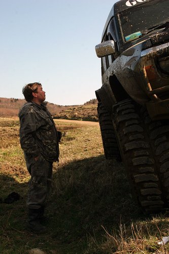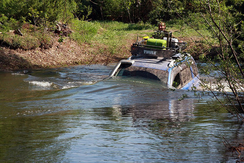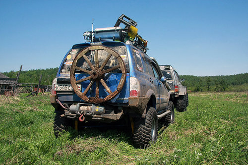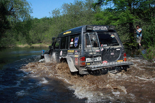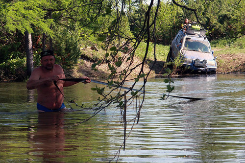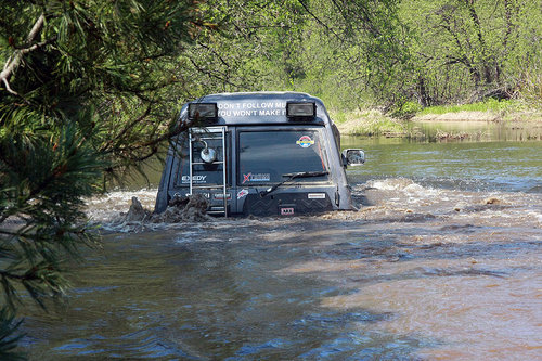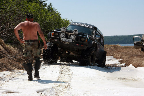 Щепки К обеду мы добили остаток большой мари вдоль залива (местами ехать приходилось прямо по снегу). И подъехали к речке Валовская, где в очень хорошем виде сохранились несколько домиков, ферма, технические помещения и даже десятифутовый контейнер. Контейнер, я вам скажу, не мятый, не ржавый, считай, новый. Такой в Южно-Сахалинске найти трудно, и стоит он, простите за меркантилизм, 20-25 тысяч рублей… а тут стоит себе никому не нужный. По одной простой причине — его проще купить, чем вывезти оттуда. На Валовском поселении мы немного отдохнули, откопали в зарослях травы настоящее колесо от телеги, по нашим прикидкам дюймов так в 40…. Раритет! Приложили к машинам в виде запаски — смотрится издевательски гламурно. Но тащить то колесо домой никто не захотел. Взяли резвый старт из поселения, проехали до реки 100 метров… и тут же поняли, что тот, наш первый брод, был просто ручьем пересыхающим по сравнению с Валовской в половодье… Я сразу так и подумал — вот и конец нашего путешествия, нам эту реку ни в жисть не переехать, не переплыть… Мало того что течение напористое и глубина недетская, так еще и противоположного выезда из реки из-за разлива не видать. Выход из реки был где-то там, далеко между деревьями. Постояли, помолчали, посмотрели в мутную воду. Решили по-простому — пусть переедет Годзилла, а там уже видно будет… Годзилла большая, тяжелая (четыре тонны с лишним), капот от земли метра полтора, ну что ей будет… Такие машины не плавают. Не то что Эскудо — метр воды и уже поплыл, хорошо, если не кверху брюхом. Макс Годзилла говорит — «ОК, давайте попробуем, я пройду, а вас на тросе перетащу, чтобы не уплыли далеко». Так и договорились. Годзилла мощно и уверено заходит в воду и…. сразу же наступила почти полная тишина. Весь рокот и тракторный звук ниссановского дизеля исчезли, осталось только бульканье и невнятные пузыри. Ни дать ни взять, подводная лодка в надводном положении. Блин, подумал я, как глубоко-то…. Годзилла прошла по инерции еще пару метров, вот уже вода скрыла, бампер, стопари, фары, только ручки дверей оставались выше ватерлинии… И тут случилось невероятное — четырехтонный Сафарь, ну просто наковальня на колесах… поплыл! Перестал двигаться вперед, стал разворачиваться боком и смещаться вниз по течению вниз реки. «Вот и полный конец нашему путешествию» — вновь подумал я, в этот раз исключительно матом! Между тем Сафарь все больше смещался вниз по течению, течение разворачивало машину носом к стремнине, даже вода под машиной перестала бурлить и булькать, но видно было, что двигатель работал уже в морском режиме — «полный вперед» и где-то в глубине 4 44-х боггера непрерывно вращались, словно колеса речного парохода. Стало совсем не весело…. Более того, было совершенно очевидно это уже не шутки и Сафарь реально борется за свое выживание. Глаза у всех были по рублю, как минимум… если бы у меня был стеклянный глаз, он бы точно выпал… Трудно оценить всю серьезность ситуации, не зная настоящих размеров Сафаря. Может быть эта фотография поможет! К счастью железный бог Эндуро не дал заржаветь Сафарю в реке вдалеке от дома — машина стала набирать воды, осела и может быть поэтому, уже ниже по течению, Сафарь стал цеплять колесами дно и как портовой буксир, развернувшись на 180 градусов посреди реки, сантиметр за сантиметром выплывал в сторону спа
