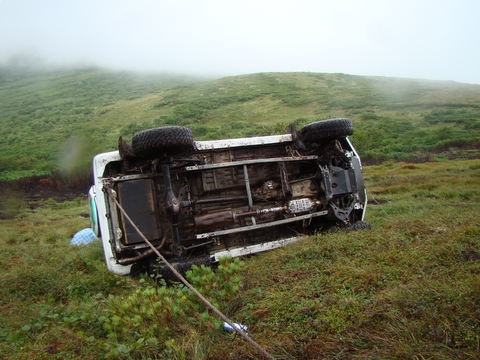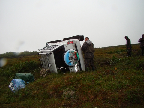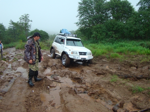Вообщем в суботу утром выехали на б. Светлая, дорога заняла 2,5 часов. Пробыли один час и домой (ветер, дождь, в море выходить не стали) Дорога назад заняла почти сутки (с учетом ночлега), т.к. на одном эскудике проблемы с раздаткой были. Я завалился на бок, точнее мягенько приземлился, даже ничего не замял!!! и не сломал!!!