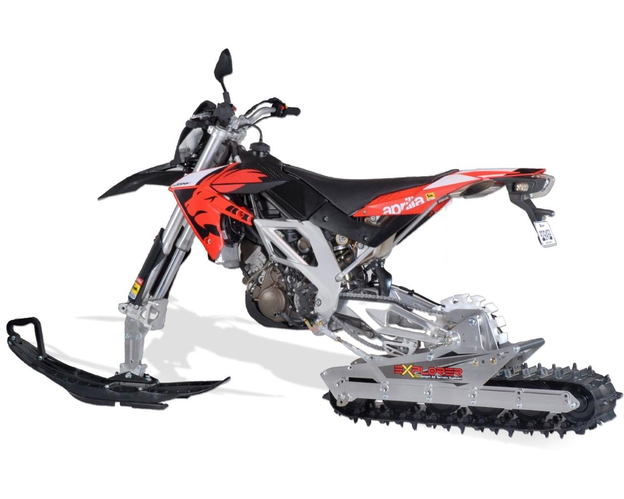 EXPLORER продолжает продвигать в массы альтернативный взгляд AD Boivin на зимнее катание и позволяет превратить практически любой эндуро, кроссовый мотоцикл или супермото в снегоход, при помощи замены переднего колеса на лыжу, а заднего на гусеницу. Инженеры провели немало часов над проработкой комплекта. Результат впечатляет: EXPLORER можно установить на мотоцикл с двигателем от 250 до 800 «кубиков» примерно за час. Комплект рассчитан так, чтобы использовать при установке все детали от стандартного мотоцикла. Таким образом, такие детали мотоцикла, как: тормозная система, задняя вилка или амортизатор, остаются оригинальными. Увеличение массы мотоцикла на 20-35 килограмм (зависит от модели) значительно улучшает сцепление гусеницы с грунтом. Разумеется, комплект обладает широкими возможностями по настройке. Так, расположенные вдоль гусеничной системы шесть штифтов, позволяют достаточно легко сдвигать ее вперед или назад, приспосабливая к различным типам местности. Направляющие задней подвески имеют выпуклую, дугообразную форму, что позволяет уменьшить пятно контакта на твердом снегу. Для передачи вращательного движения на гусеницу, используется простая и логичная система соединений, жестко связанная с задней вилкой мотоцикла, осью и тормозной системой. Крепеж адаптера лыжи позволяет в достаточно широких пределах поднимать переднюю часть мотоцикла – до четырех дюймов. Лыжа оснащается двумя коньками. При наклоне мотоцикла до 6 градусов, за счет шарнирного соединения лыжа не меняет своего положения, оставаясь параллельно поверхности снега и готовя его для гусеницы. Как отмечают в AD Boivin, комплект EXPLORER позволяет адаптировать мотоцикл к практически любому типу поверхности – снегу, песку, грязи… Например, для езды по песчаным дюнам, можно оставить переднее колесо, но поддержать его гусеницей, а для езды зимой по снегу, установить полный комплект. -------------------- |