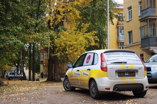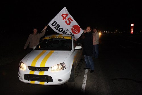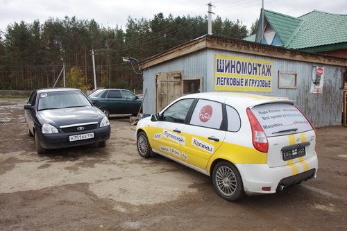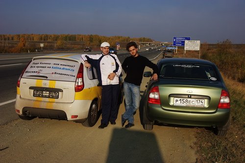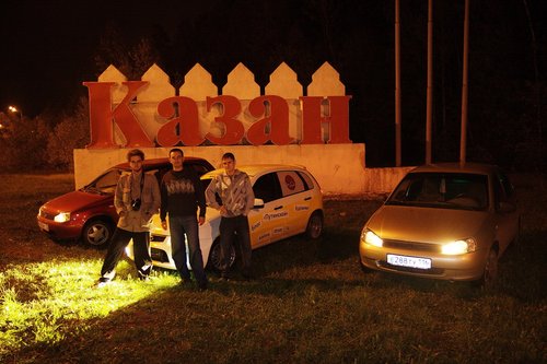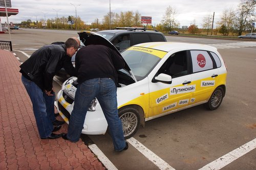 На сегодняшний день пройдено чуть более 2000 км. Калина едет! По трассе она идет очень неплохо — приятная приспортивленная подвеска, отсутствие сверчков в салоне, радует пакет опций и расход топлива. Но шумно, конечно. Запаслись всякой всячиной. Перед выездом нашли открутившийся болтик. Вроде бы некритичный, для массы. Вывалился из отверстия сверху. Прикрутили обратно. Нет одного крепления держателя капота (справа). Одновременно включены антирадар, навигатор и инвертор для зарядки ноута и телефона. Приборная панель Калины. В точности соблюдая инструкцию по обкатке, первые 500 км мы ехали со скороfстью не более 90 км/ч, а сейчас едем не более 110, и так будет до пробега 3000 км. Пробег 500. Наконец-то можно разогнаться выше 90! У нас есть антирадар и навигатор — незаменимые вещи в такой дальней дороге. А вот так видно через заднее стекло (многие интересовались, как можно ехать с залепленным задним стеклом). Если присмотритесь, увидите буквы. По дороге, переполненной фурами, ехать грустно. Хорошо, что в данном случае это не в нашу сторону. В режиме городской езды по неровным дорогам есть проблемы — описанный ранее гул не ушел, плюс опять же на медленном ходу прибавился какой-то новый звук от подвески — ощущение, как будто лежишь на водяной кровати, и она так протяжно глубоко побулькивает под тобой. Посмотрим, что скажут на СТО. Заехали на шиномонтажку — давление было 1.5 вместо 2.0, мы не удосужились проверить это сразу Проблемы с температурой на трассе нет, она стабильно держится чуть ниже 90 — Карлсон работает На текущий момент пройдено три города — Казань, Уфа и Курган. Фото-репортаж: Перед выездом с Москвы. Поймать нас успел только Алекс(ДВ) (слева). Встречи с форумчанами: в Чебоксарах... ...в Казани... Казань — идет сравнение двух Спортов. Казанский Кремль. Мечеть Кул Шариф в Казанском Кремле. Офигенная архитектура. ...в Набережных Челнах... Женя white bear все-таки испортил нам заднее стекло ...в Уфе... Торжественное вручение эксклюзивных сувенирных номеров Дрома Евгению white bear (Уфа). Полтора года обещали... Памятник Салавату Юлаеву в Уфе Максим с ЛКК(лада калина клуб прим. polosatiy) пропилил 70 км на встречу с нами под Челябинском ...в Кургане. Курган. Очередной город на карте! Тест-драйв у Володи в деревне под Челябинском. Мы не поехали в Екатеринбург, так как в Кургане нам пообещал обеспечить первое ТО известный дромовский форумчанин Алексей Antropoff. Он сам ездит на Ладе и работает инженером по гарантии ВАЗа! (привет тем, кто по старинке привык считать Drom.ru сайтом праворульщиков). Нам тут писали, типа это нечестно — ТО надо проходить не по знакомству, а по-простому, испытав все прелести русского сервиса и отношения. Но, во-первых, с такими наклейками обычный сервис уже вряд ли получится, во-вторых, нам ехать далеко и долго, и хотелось бы быстро решить проблемы, а не зависнуть в Кургане, в-третьих — Алексей обеспечит фотосъемку процесса и честные профессиональные комментарии о состоянии машины. В-общем, сегодня утром Калина отправилась на первое ТО, которое надо пройти с 2 до 3 тысяч км. План свести встречи в городах к минимуму, похоже, провалился В Калине мы даем посидеть и немного прокатиться всем желающим. Как правило, владельцы Калин отзываются хорошо, владельцы иномарок — некоторые говорят, что едет неплохо, некоторые — что хреново. Внешний вид нашей Lada Kalina Sport, в принципе, 