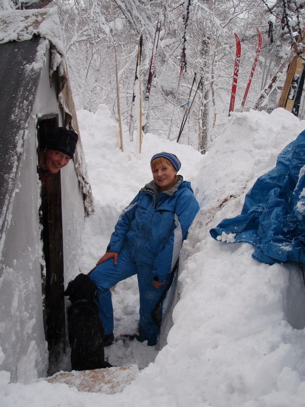Не смотря на ночной декабрьский дождь, собрались и выехали из города в 10. Под Арманским перевалом второй день стабильные -2. По ходу движения повалил плотный снег и основательно начало задувать с гор. Решили далеко не ходить, а докапать "Приют Лето" и починить продавленный снегом сектор крыши над печкой.