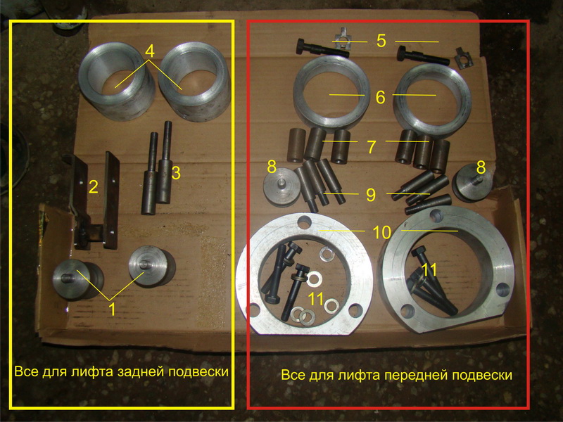 Как и обещал предоставляю полный отчет по лифту своего Эскудо. Кузов TD52W. Двигатель J20A. Вообщем облазил всё в интернете, что касется лифтаЭскудика. Встречались лифты Эскудиков просто до безумия «фанатичные». Но остановился, ПОКА, на мой взгляд, на самом безболезненном. То есть 2,5 дюйма или 5 см. Если к этому прибавить резину 235/70/16, то в итоге получил прибавку по высоте порядка 6,5 см. Сразу скажу отдельное спасибо: - за токарные работы: «rap51» - Анатолий; - за консультации по всем нюансам «krokodil vasy» - Геннадий. - Дену за бокс. - и дв.брату Алексею. Итак, есть замечательная страничка в интернете: «http://suspensionlift.ru/suzuki-escudo-2» , думаю, что многие на нее выходили в поисках боди-лифта. Комплекты там представлены на все модели эсудиков (круглых, квадратных). К слову сказать у «krokodil vasy» - Геннадия стоит подобный. Причем он уже юзает его достаточно давно и без нареканий. Сам смотрел, проехался – одним словом просто замечательно. Но я пошел несколько другим путём. Нашел в интернете все чертежи проставок под пружины, стойки и отбойники. Отдал в работу «rap51» и через несколько дней получил следующий комплект. Описание: 1- Увеличители задних отбойников 2- Проставка для тяги панара 3- Солдатики для увеличения задних амортизаторов. 4- Поставки для задних пружин. 5- Специальные болты с эксцентриками, для регулировки развала предних колес. (после установки они пожи на букву «V». 6- Проставки плд передние пружины. 7- 11- Втулки и болты для подьёма на необходимую высоту поперечной балки между передними стойками. (находится под капотом и не увсех «круглых» она стоит) А если стоит, то после лифта она опускается прямиком на движку. Поднимать распорку не приходится тем, кто вместо проставок под передние стойки выточил удлинители штока передних стоек. (Болты: 6 шт. автомобильные M10x1,25 длиной 60-65 мм, 6 шайб к ним.) 8- Увеличители передних отбойников. 9- Увеличители резбовых креплений стойки к кузову. 10- Поставки под передние стойки. Итак все по порядку. Сразу скажу, что вышеуказанный комплект ставится, если Вы ВООБЩЕ не собираетесь ничего менять из подвески. Есть один нюанс. Для увеличения задних амортизаторов вытачиваются специальные «солдатики». ОНИ на фото №3. Я не стал их ставить, а просто купил в «Школе-магазин» два амортизатора от волги 31029 с креплениями шток-ухо желтого цвета по 640 рублей. Подходят идеально, при этом нижнее крепление так же требует не сложной доработки, необходимо в нижнюю часть амортизатора (там где должен быть салейнблок, у Волговского там просто две резинки)вставить втулку для болта, подходит от любого старого саленблока. Для работы нам понадобятся набор ключей и головок : 10,12,14,17,19, пасатижы, сьемник стопорного кольца с передних приводов, молоток, газовый ключ (нужен, что бы откручивать отбойники), два домкрата, смазка шруз, ну иконечно гараж с ямой и со всеми удобствами. Да чуть не забыл. Обязательно заранее купите длиный тормозной шланг. Родной слишком короткий. (Для образца могу дать родной.). Ну и соответственно после его установки требуется прокачка тормозов. Стяжками пружин я вообще не воспользовался. Все можно сделать и без их участия. «Проверено на себе». Заганяем в гараж, ставим на ручник, ставим откатные устройства и начинаем... Я начал с передка. Перво – наперво ослабиваем все салейнблоки как с переди, так и с зади (чтобы не забыть) ... откручиваем тягу стабилизатор