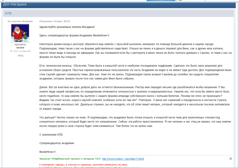 Ректорат затребовал у меня ссылки на темы о благотворительности и личную переписку с этой Юлией. После изучения всех ссылок и сркинов мне поручили выложить на этом форуме официальный ответ Международной Академии MasterForex-V