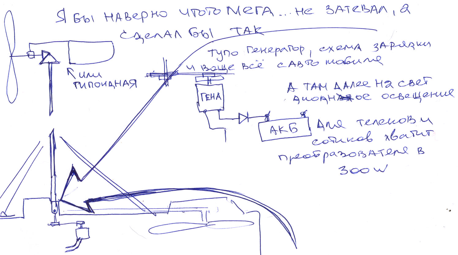 Цитата(dissector @ 29.6.2012, 14:07) ссылка доступна только зарегистрированным dissector, А вопрос и не идет об больших мощностях. Идея зарядки акума и не более. Если бы я там жил на "постоянке", то вопрос другой. Но ради 2 -3 дней в неделю "городить огород".... Поэтому сделаем огород попроще.., раз всё равно приходим к старому доброму акумулятору.,, то и схему берём с зарядным и генератором с АВТО Где нужен свет переходим на светодиодную подсветку (дабы снизить потребление + в запасе добрый ИНВЕРТОР, ватт на 150, сотики, телек, бук до 17", но уж 300 ватт любой телек потянет И быренько строим, дабы не переросло в ДОЛГОСТРОЙ.., (у меня обычно так) Я тут рисовал...: О! Можно конечно и на верх этот генератор прилепить, но полюбому понадобится.., какойто редуктор, И я склоняюсь к ременному, как на стационарных сверлильных станках, чтобы менять передаточное, при сильном ветре.., ну вы поняли. А вообще конструкция с лопастями, может увеличится сильно в размерах., от предполагаемых.. Ну както так. -------------------- Почта: maykov@mail.ru ...... icq: 610 723 439 ...... WatsApp 89140319611