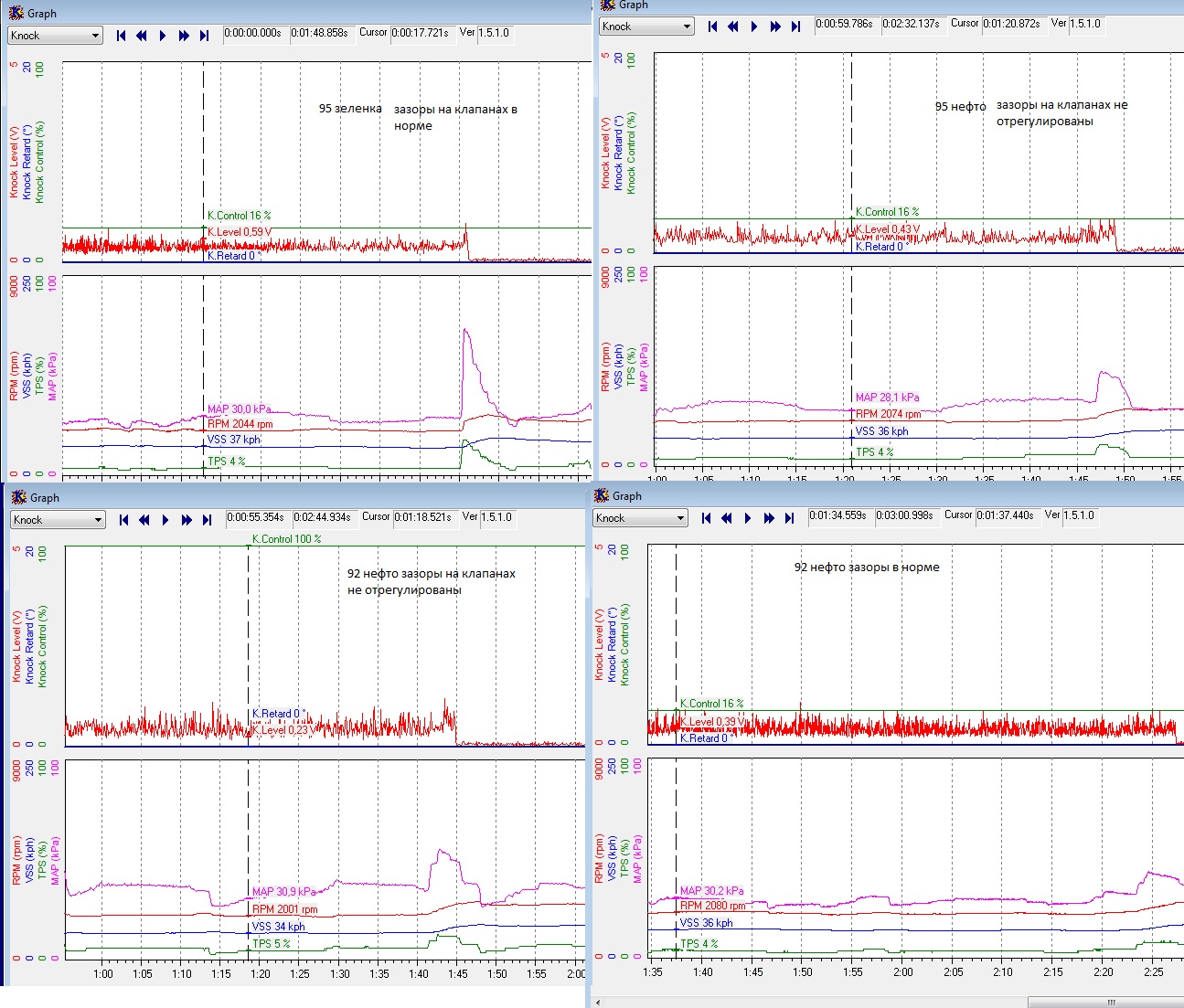 95 нефто пики датчика детонации 0.87 не были отрегулированы зазоры на клапанах (зазоры были жесть, ХХ гуляли)