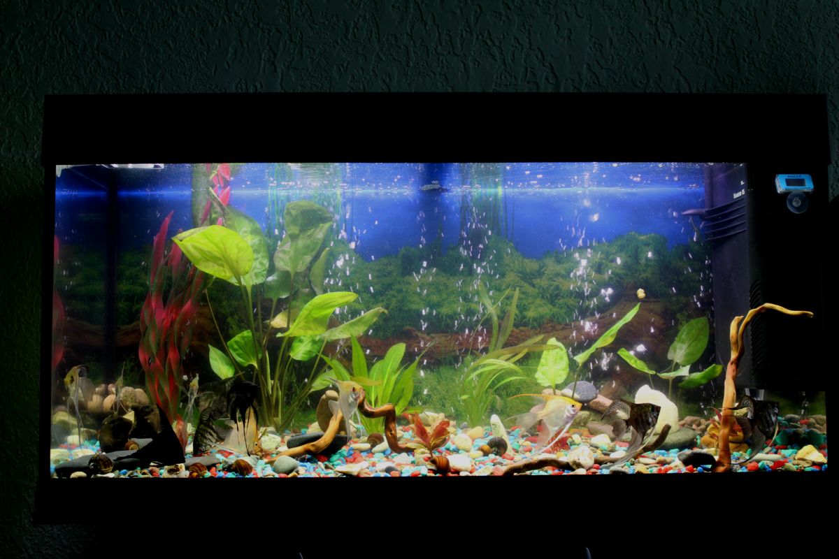 Джиперс, Хороший аквариум. Только мне глаза режет очень яркий грунт... Если я не ошибаюсь, то скалярии и гурами любят грунт темный. Им так комфортней.