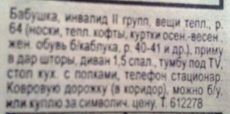 объявление из экспресс-газеты. Может у кого-нибудь найдется то,что Вам не нужно, но необходимо этой бабушке. Ее телефон 612278