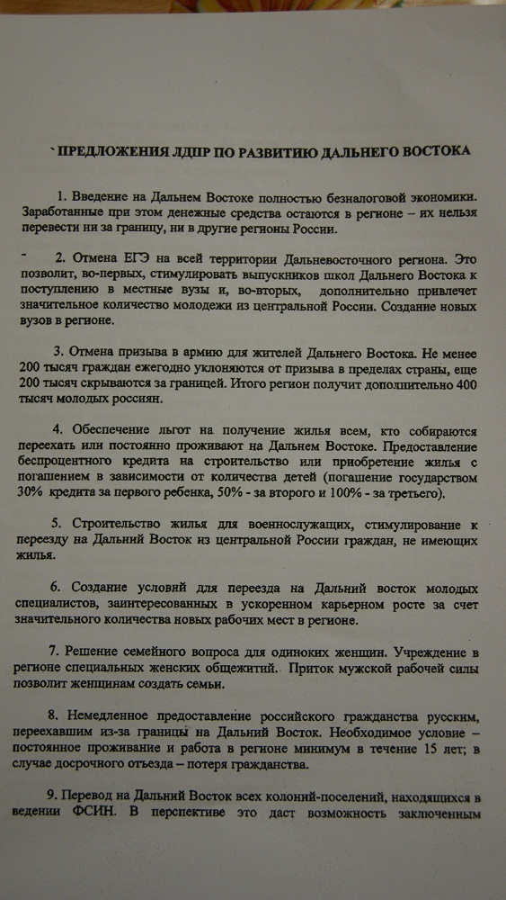 ЛДПР автор. Мне в принципе тоже читать было смешно всё это, так как мне как и вам кажется, что это всё из области фантастики, что бы правительство в Москве вспомнило про свой народ на Дальнем Востоке.