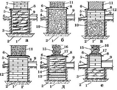 Рис. 31. Каменные столбы: а — бутовый; б — бутобетонный; в — кирпичный по бутобетону; г — кирпичный; д — бутовый по утрамбованному грунту; е — кирпичный по буту; 1 — материковый грунт; 2 — песчаная подушка; 3 — постелистый камень; 4 — отмостка; 5 — цоколь; 6 — гидроизоляция; 7 — кирпичная стена; 8 — цементнопесчаный раствор; 9 — пол; 10 — бут, бетон; 11 — стена; 12 — кирпичный столб; 13 — подполье; 14 — бутовый камень; 15 —
