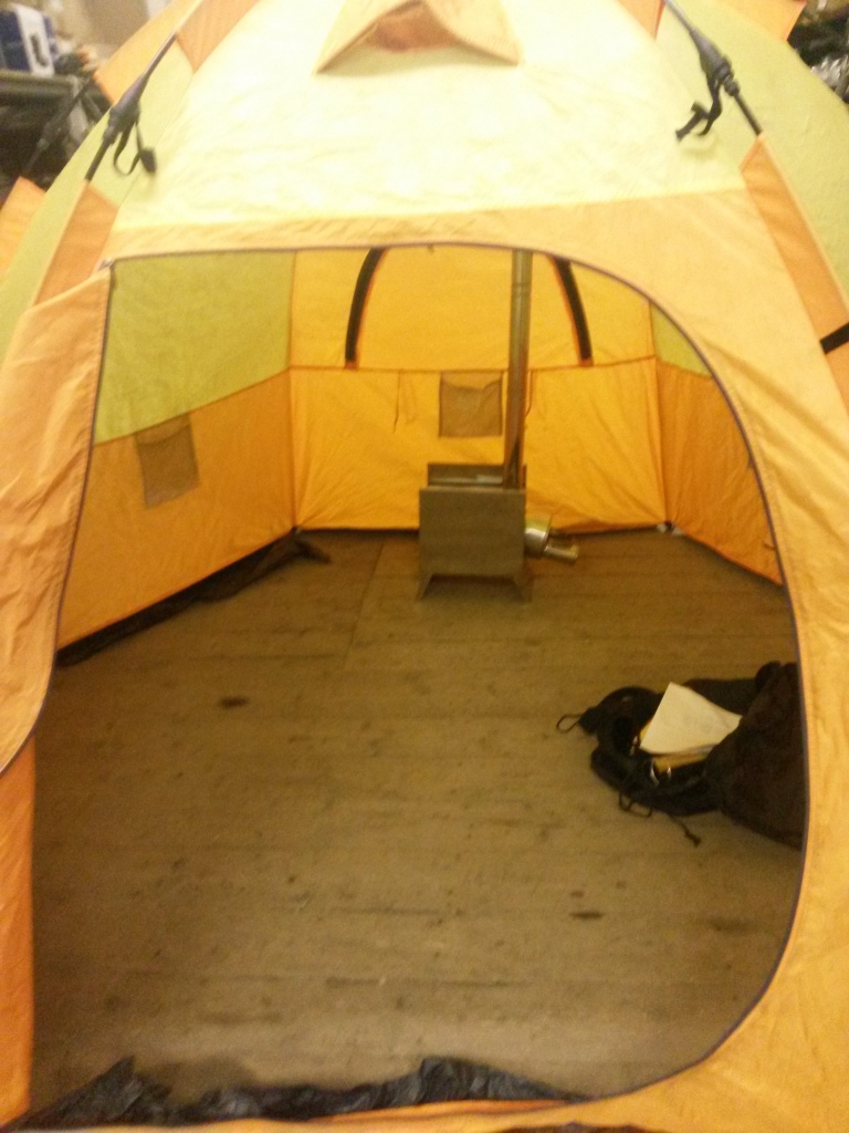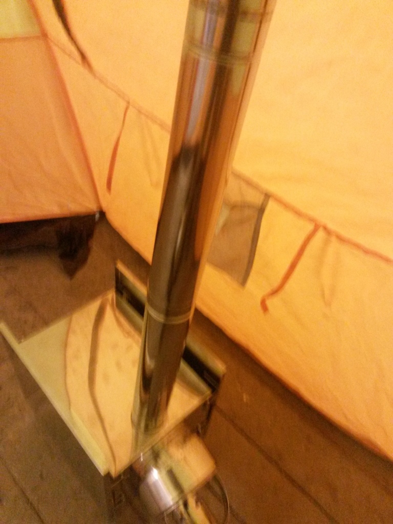 Пока что имеешь неприспособленную палатку, которой все равно где делать бырку под жестянку для трубы. Сделай ее в правильном месте.