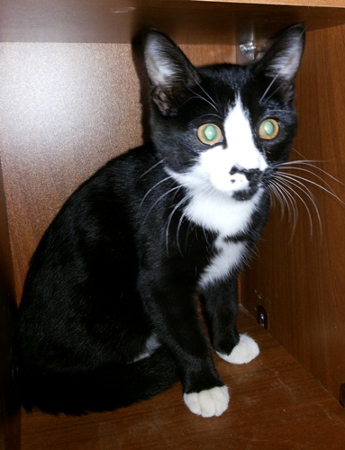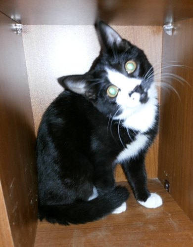 В подъезде появилась киса, от страха аж на стену лезла, вся тряслась, на вид месяца 4-5, вроде девочка, посмотреть нормально не дает, очень симпатичная - черненькая, манишка, грудка, лапки белые, на морде белые пятнышки и шикарные белые усы и брови. Худая, но выглядит здоровой. Завтра свозим к ветеринару. Маленький дикаренок - всего боится, с людьми явно не общалась, но ее кто-о сильно запугал.