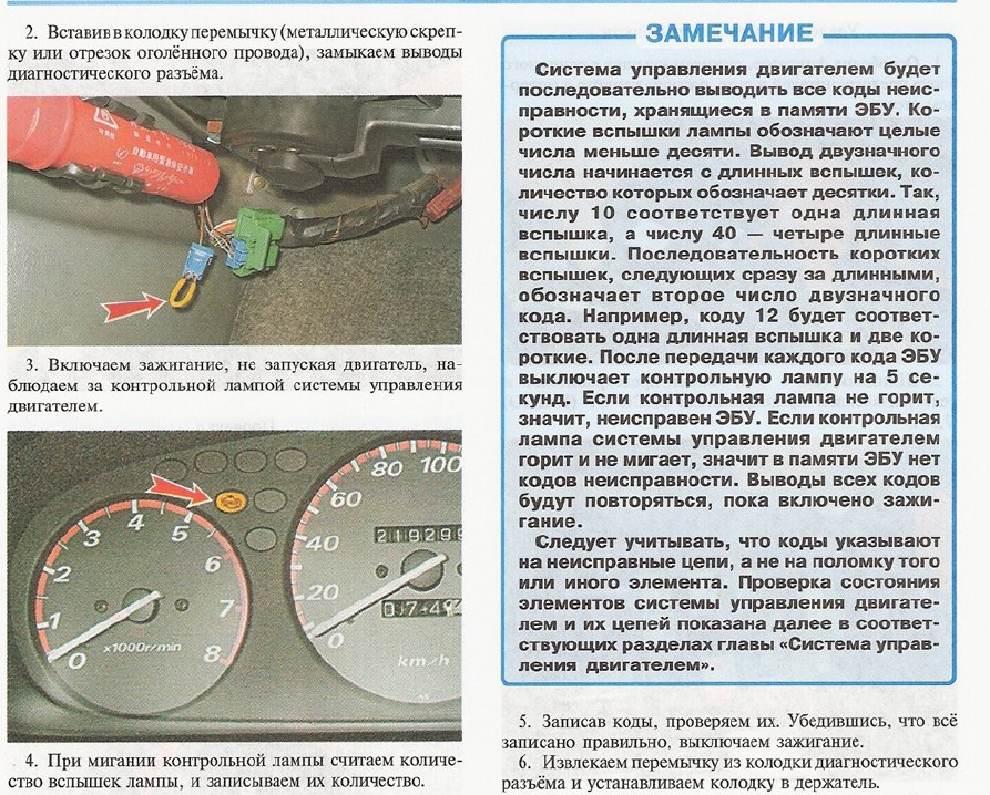 Если после запуска двигла чек-енжин тухнет, это необязательно означает, что ошибок нет. Обычно требуется включить режим самодиагностики. Как это сделась и считать коды ошибок по миганиям лампочки - описано в мануале. Обычно требуется переменуть пару контактов в диагностическом разъёме или что-то подобное - процедура более чем доступная.