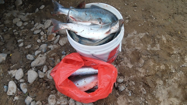 С рекогносцировочной задачей съездил в понедельник вечером на Олу. От Клепки до впадения Наледного вода прозрачная, ниже - мутновата, видимость где-то сантиметров на 25. Кое-где стоит кета на нересте. Горбуши видел совсем мало, да и дело к сумеркам уже было.