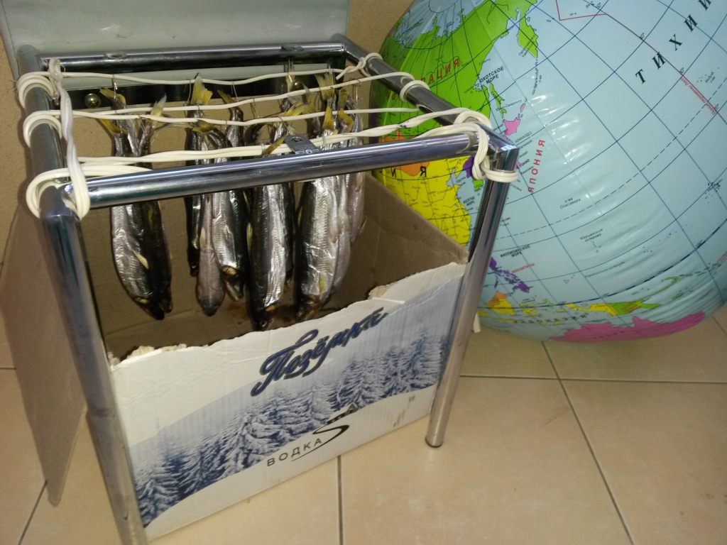 Есть такая приблуда из тонкого металлического прутика для сушки белья. Вешается крюками на батарею отопления. Образует три параллельные перекладины. У меня на батарею влазит две таких вешалки. Вешал на них при помощи канцелярских скрепок. Влазит несколько кг рыбы.