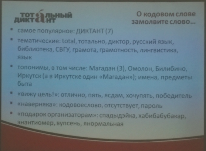 ссылка доступна только зарегистрированным Что такое Тотальный диктант? Это ежегодная образовательная акция, призванная привлечь внимание к вопросам грамотности и развить культуру грамотного письма. Суть акции — добровольный бесплатный диктант для всех желающих, который проходит одновременно в десятках городов России и мира (с поправкой на часовые пояса). Тотальный диктант — это своеобразный флеш-моб. Незнакомые друг с другом люди узнают об акции в Интернете, собираются в одно время в одном месте, совместно делают нечто странное и расходятся. Цель Тотального диктанта — предложить людям задуматься, насколько они грамотны, и привить желание эту грамотность повышать. Когда будет Тотальный диктант? Тотальный диктант-2015 пройдет 18 апреля, по всему миру в один день. Время начала отличается от города к городу, но дата везде одна и та же. В Магадане Тотальный диктант начнется в 16 ч. по местному времени. Где получить подробную информацию о Тотальном диктанте в Магадане? Время начала акции, адреса площадок, контакты организаторов и другую важную информацию можно получить на ссылка доступна только зарегистрированным и в социальных сетях. Ну и здесь, конечно, отвечу на все вопросы! Какой текст будут писать на Тотальном диктанте в 2015 году? Тотальный диктант всегда пишется по тексту, специально написанному для проекта современным автором. Автором текста международной акции по проверке грамотности «Тотальный диктант» стал русский писатель Евгений Водолазкин (http://totaldict.ru/news/1625/). Самыми знаменитыми его работами стали «Соловьев и Ларионов» и «Лавр». Текст специалиста по древнерусской литературе, доктора филологических наук, сотрудника Пушкинского Дома, специально подготовленный для акции «Тотальный диктант», называется «Волшебный фонарь» и рассказывает о жизни дореволюционной России. Как и в прошлые годы, текст состоит из трёх частей, первую из которых напишут Дальний Восток, Восточная Сибирь и зарубежные страны этого часового пояса. Вторую часть – Урал и Западная Сибирь. Третью часть диктуют в европейской части России и Европе, позже всех пишет Америка – тоже третью часть текста. Кроме того, Тотальный диктант-2015 можно будет написать онлайн на сайте totaldict.ru, воспользовавшись трансляцией, которую обеспечивает федеральный телекоммуникационный партнёр проекта Компания ТТК с площадок в Иркутске, Новосибирске и Москве. Как зарегистрироваться для участия в диктанте? Зарегистрироваться для участия в Тотальном диктанте можно только на сайте totaldict.ru с 7 часов утра по магаданскому времени 7 апреля 2015 г. Обязательно ли регистрироваться, чтобы стать участником? Нет. Мы стремимся сделать так, чтобы на Тотальный диктант можно было прийти спонтанно, без предварительной регистрации. К сожалению, это не всегда возможно. Некоторые площадки имеют ограниченную вместимость, и без предварительной регистрации все желающие там просто не поместятся. Но в Магадане есть открытая площадка, на которые регистрироваться не нужно. В списке площадок на городской странице рядом с открытой площадкой вместо кнопки «Зарегистрироваться» стоит кнопка «Я пойду!». В Магадане планируется несколько площадок для проведения Тотального диктанта: • Северо-Восточный государственный университет (площадка без обязательной регистрации) — не менее 300 мест; • Магаданская об