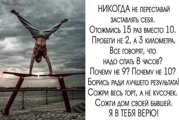 Вопрос тренировки. Заставив себя сегодня сделать 10 отжиманий, завтра 10, через неделю 11, через ещё неделю 12, к концу года их можно сделать 100. Позвольте внести корректировочку.. На лыжах катался в далёком детстве, но принцип нагрузки на самую выносливую часть тела построен верно. С отжиманиями же результативная схема выглядит иначе: берём среднее кол-во отжиманий, например 25, и варьируем кол-во повторений в этом диапазоне обязательно в пяти подходах! Т.е. 20, 17, 19, 16, 18. На отдых строго 36 часов, после этого времени следующая тренировка 22, 19, 21, 20, 20 должна быть выполнена в течении 8 часов! И так по нарастающей где-то по 8-10 повторений на 5 подходов прибавляешь. Не справился - без всяких понтов снизил нагрузку на 4 повторения, снизил, не оставил прежней. При ответственном подходе к данной системе тренировок, результат в 100 отжиманий будет достигнут через 60 дней. Один подход в день не канает, это только разогрев.. -------------------- This is all about love, this is all about hate
