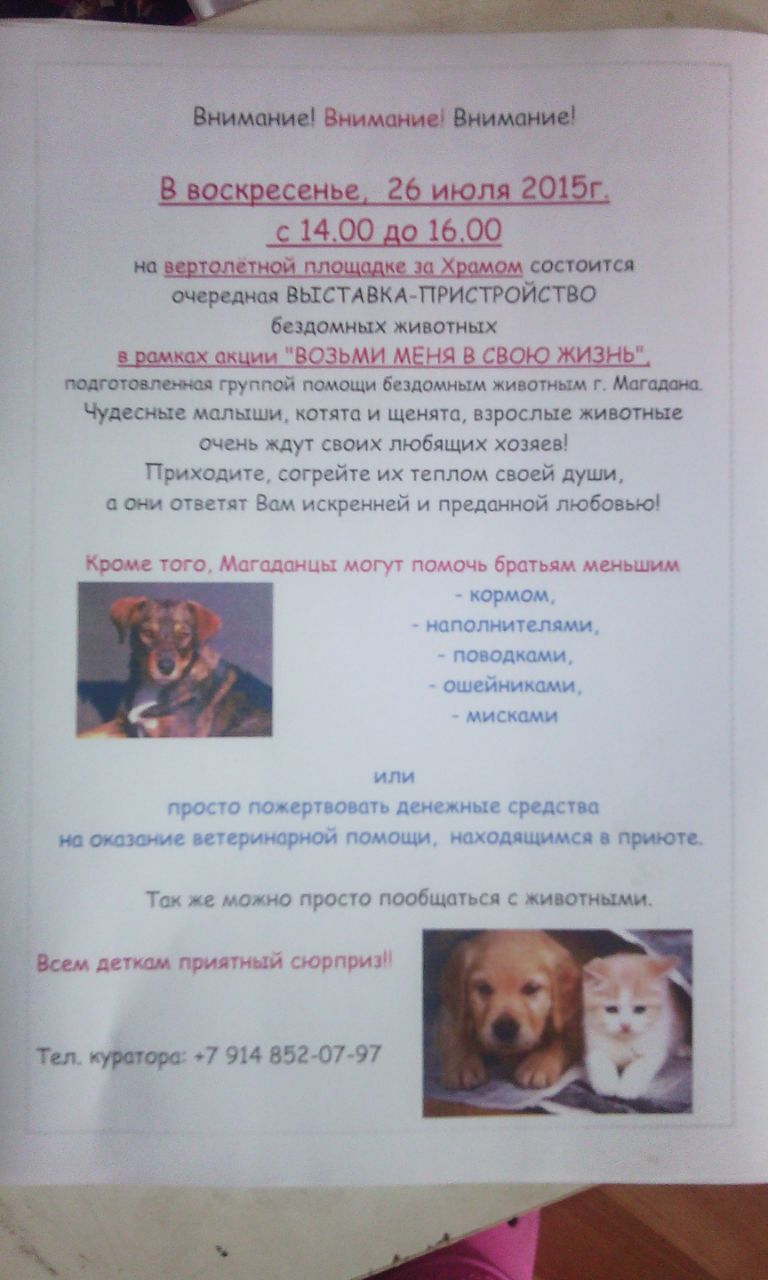 Благотворительная акция 26 июля 2015 года с 14,00-16,00 на вертолетной площадке за Храмом -------------------- Стерилизуйте дворовых и домашних любимцев!