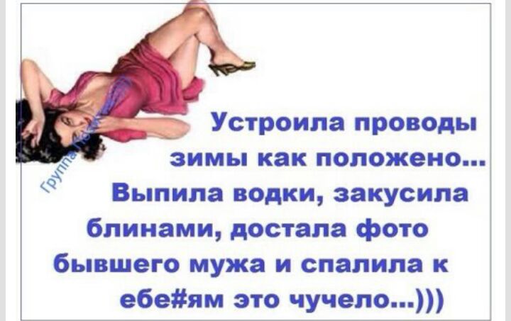 Блин....вот как надо было то...... ....или так: "....отмечали с девчонками Масленицу. привезла домой чучело. с утра проснулась...., а он ничего так....хозяйственный. оставлю пока. если что, сожгу позже.""" вот я дурында)))) -------------------- Без запретов и следов,