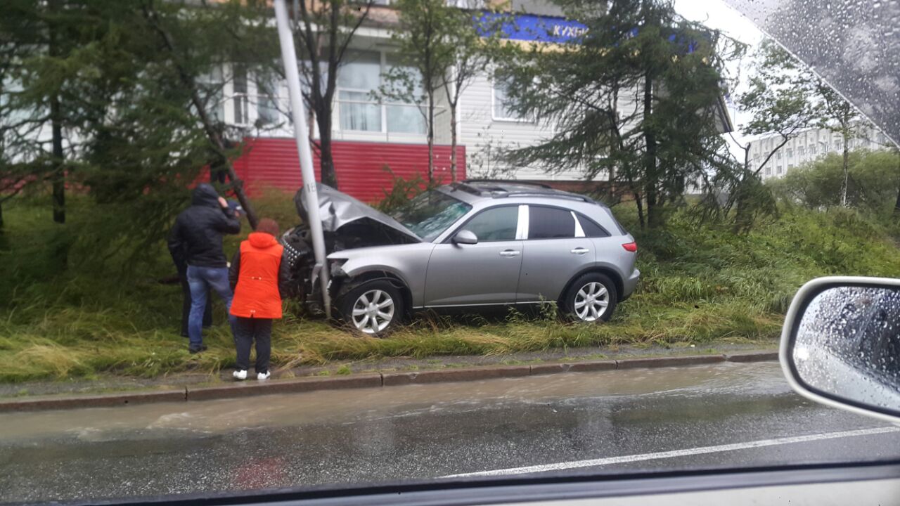 Возле магазина Комфорт, который на лукса(или как там его), серый инфинити в столб въехал