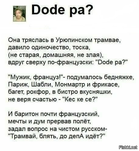 Не так хочется бабу, как её лето. Объявление в газете: познакомлюсь с Томом Крузом. Том, если ты сейчас читаешь этот номер "Подольского рабочего", позвони мне. Штирлиц долго смотрел в одну точку. Потом перевел взгляд и посмотрел на другую. "Двоеточие!" - догадался Штирлиц. Она: - Вот скажи, почему если у парня было много девок, он - мачо, а если у девушки много парней - она б...ь? Он: - Понимаешь, если один ключ открывает много замков - это офигительный ключ! А если к одному замку подходят все ключи - то это, определенно, хреновый замок! -------------------- Ремонт радиостанций,усилителей,сабвуферов 89246918246