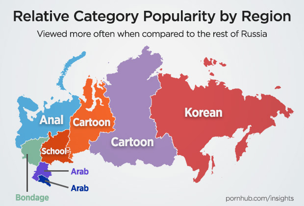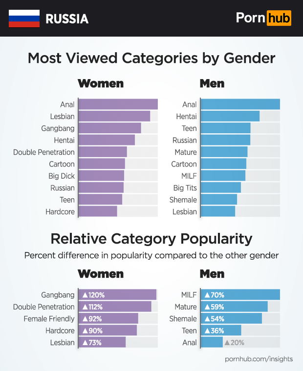 PornHub проанализировал запросы россиян и представил статистику порно-предпочтений пользователей из России, начиная с 2010 года. Результаты опубликованы в разделе Insights - ссылка доступна только зарегистрированным По данным портала, Россия занимает 12-е место в мире по числу посещений PornHub. В среднем россиянин тратит на посещение сайта 9 минут и 2 секунды, что почти на полминуты меньше, чем в среднем по миру. Средний возраст пользователей из России составляет 34 года. Четверть аудитории — женщины. Чаще всего российские любители порно предпочитают заходить на сайт в интервале между 22:00 и 23:00, а самый популярный день для этого — воскресенье. Чаще всего россияне забивают в поисковике PornHub слово «русские». Исключение составил 2016 год, когда в топ запросов вырвался косплей на видеоигру Overwatch. Самая популярная категория в России — «анал», за ней следуют «хентай», «подросток» и «русские». Наибольшей востребованностью у россиян пользуются порнозвезды Саша Грей, Миа Халифа и Рили Райд. Чаще всего пользователи из России останавливают выбор на русских, чернокожих и японских порноактерах. Это первое исследование PornHub о вкусах российской аудитории начиная с 2010 года, когда сайт для взрослых запустил русскоязычную версию. -------------------- «Ад и рай – в небесах», - утверждают ханжи.