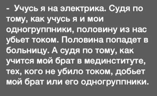 Да, к сожалению, наша современная медицина ещё далеко не всесильна. Да, зачастую пациенты сами слишком поздно обращаются за помощью к врачам. Наверняка, болезнь вашего родственника была уже настолько запущена, что сам Бог опустил руки. Почти у каждого врача, как говорится, есть своё небольшое кладбище... - Но не у логопеда же!!! Когда заливаешь бичпакет кипятком отложи небольшую часть незаваренной лапши в сторону а когда основная масса разбухнет - посыпь её сверху этими сухими остатками это придаст блюду пикантный хрустящий вкус. Пельмени будут гораздо вкуснее если перед употреблением немного смочить желудок водкой. Для готовки всегда выбирайте соусы в рецепте которых написано "добавить немного вина" тогда 50мл вина пойдёт в соус а 700мл в вас пока вы его готовите Как известно, пиво - это жидкий хлеб, поэтому если вы хотите бутерброд, но вам лень его делать, просто съешьте колбасы и запейте её пивом. - Милая, а почему ты плакала во время секса? - Мне сон страшный приснился... -------------------- Ремонт радиостанций,усилителей,сабвуферов 89246918246