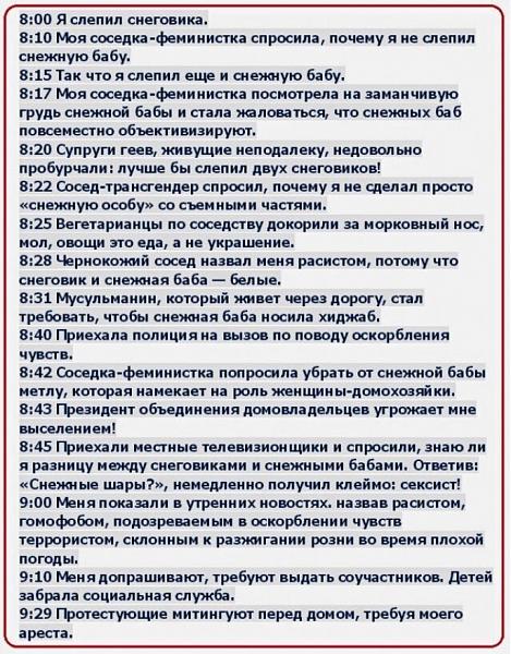 " Живу в своем доме, перед окном растет рябина, ягоды не опадают, поэтому начинают бродить. Воробушки, которые их едят, пьянеют и падают на снег. Хожу, подбираю их и заношу домой, пока не протрезвеют. Уже задолбало бухих воробушков собирать, повесил кормушку. Пусть хоть закусывают. Муж: Может ли человек одновременно быть счастливым и грустным? Жена: Ты знаешь, что у тебя самый большой член в нашей деревне? В одну и ту же воду дважды войти нельзя. А на одни и те же грабли можешь наступать, сколько душа пожелает. - Я никого не обманул, не ограбил и не убил за всю свою жизнь. Так почему я так плохо живу? - Ты сам ответил на свой вопрос. В России все болезни лечатся водкой: от одних болезней нужно ее пить, от других — не пить, а от некоторых — растираться. -------------------- Ремонт радиостанций,усилителей,сабвуферов 89246918246